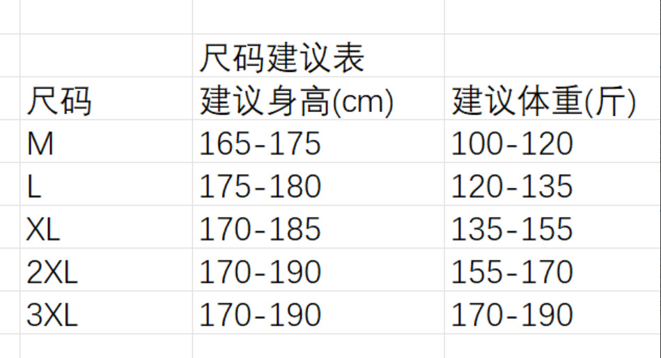 尺码 M(100-120)斤,L(120-135)斤,XL(135-155)斤,2XL(155-170)斤,3XL(170-190)斤