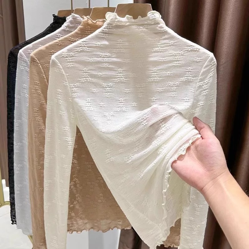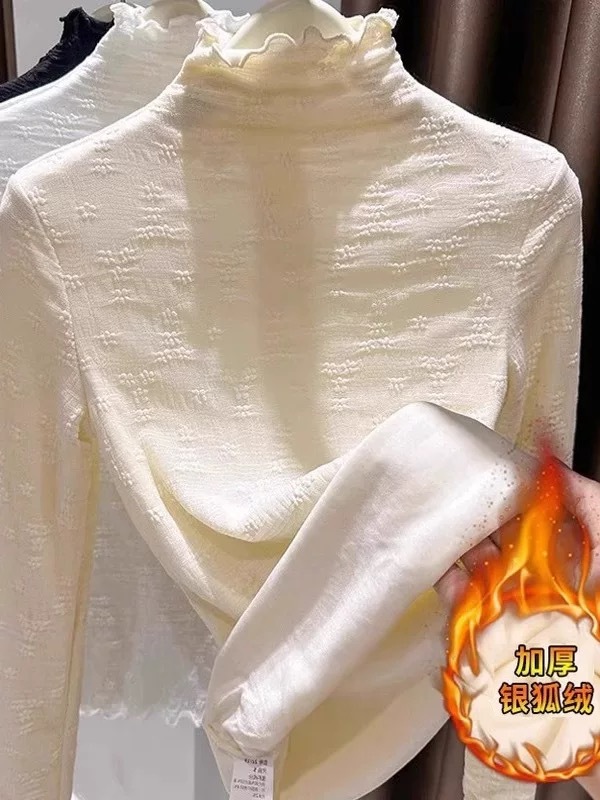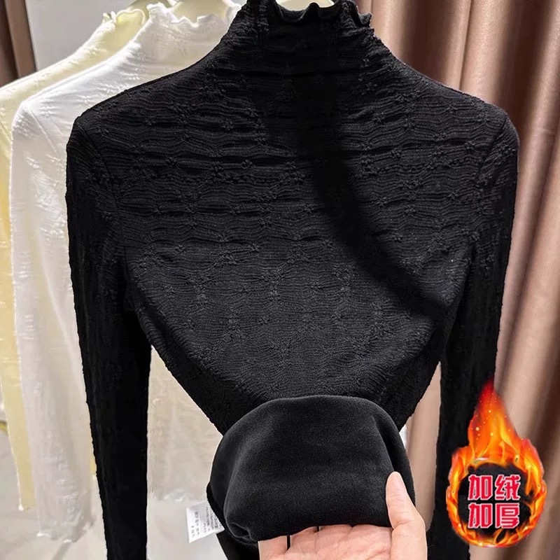 半高领蕾丝打底衫女秋冬内搭中领花边领加绒加厚德绒保暖网纱上衣