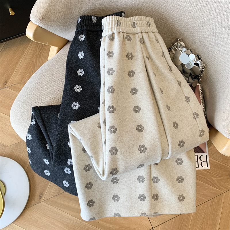 2025韩版时尚宽松百搭复古花朵休闲裤秋冬毛呢高腰阔腿裤八分裤