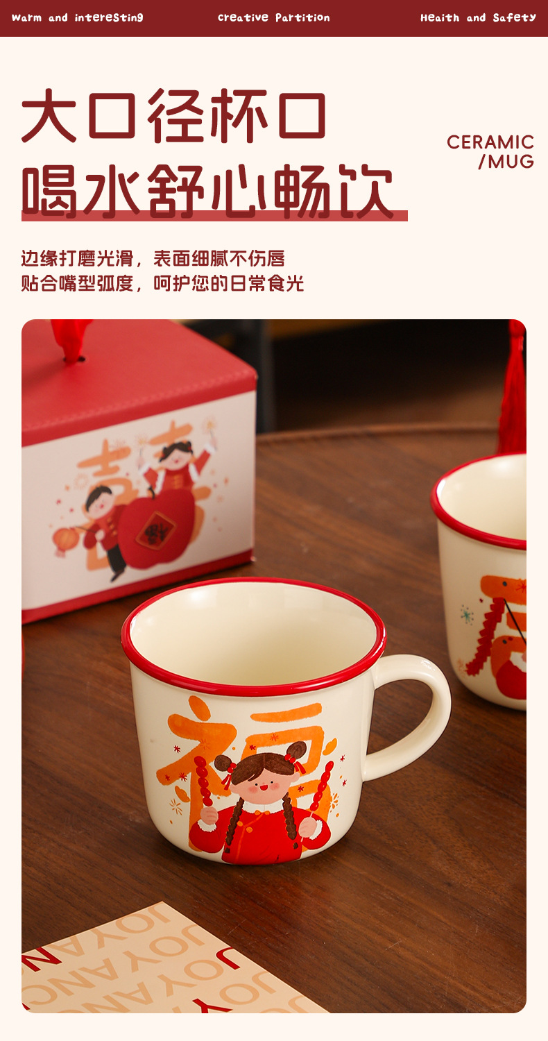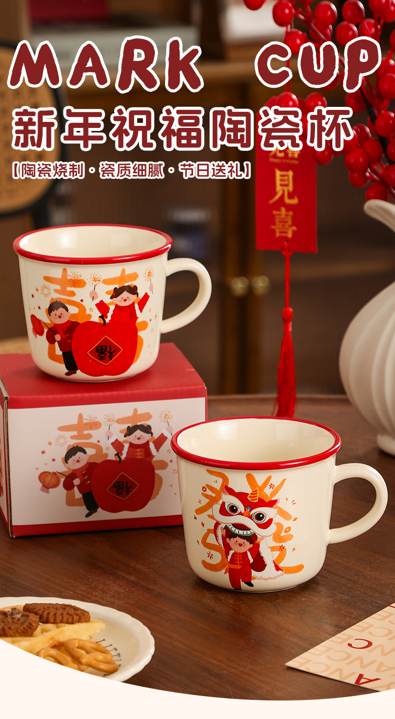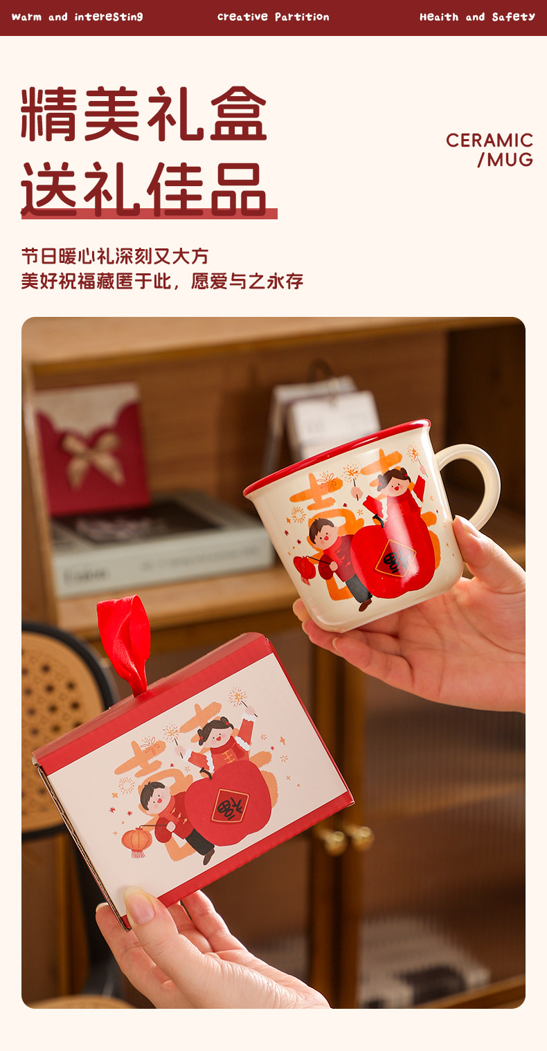 新年喜庆陶瓷杯好寓意马克杯伴手礼带盖家用水杯茶缸新中式搪瓷杯