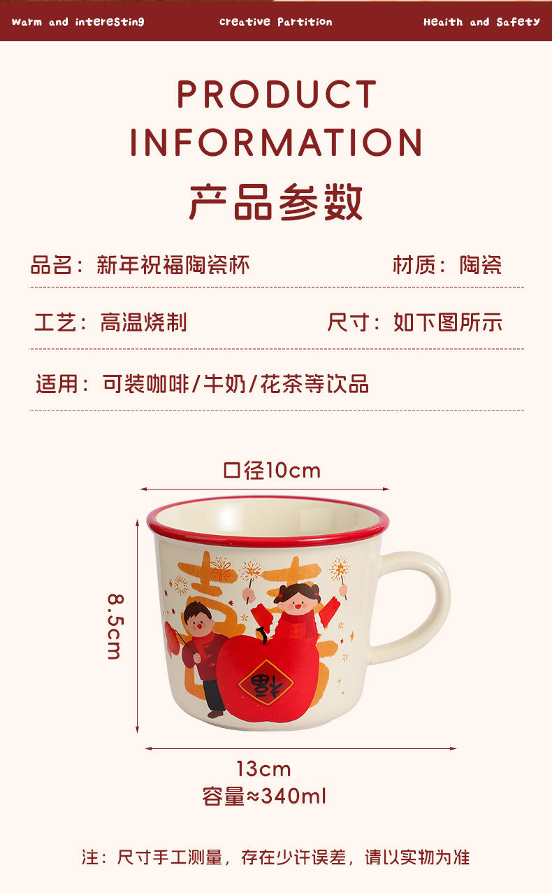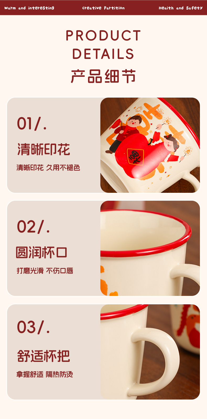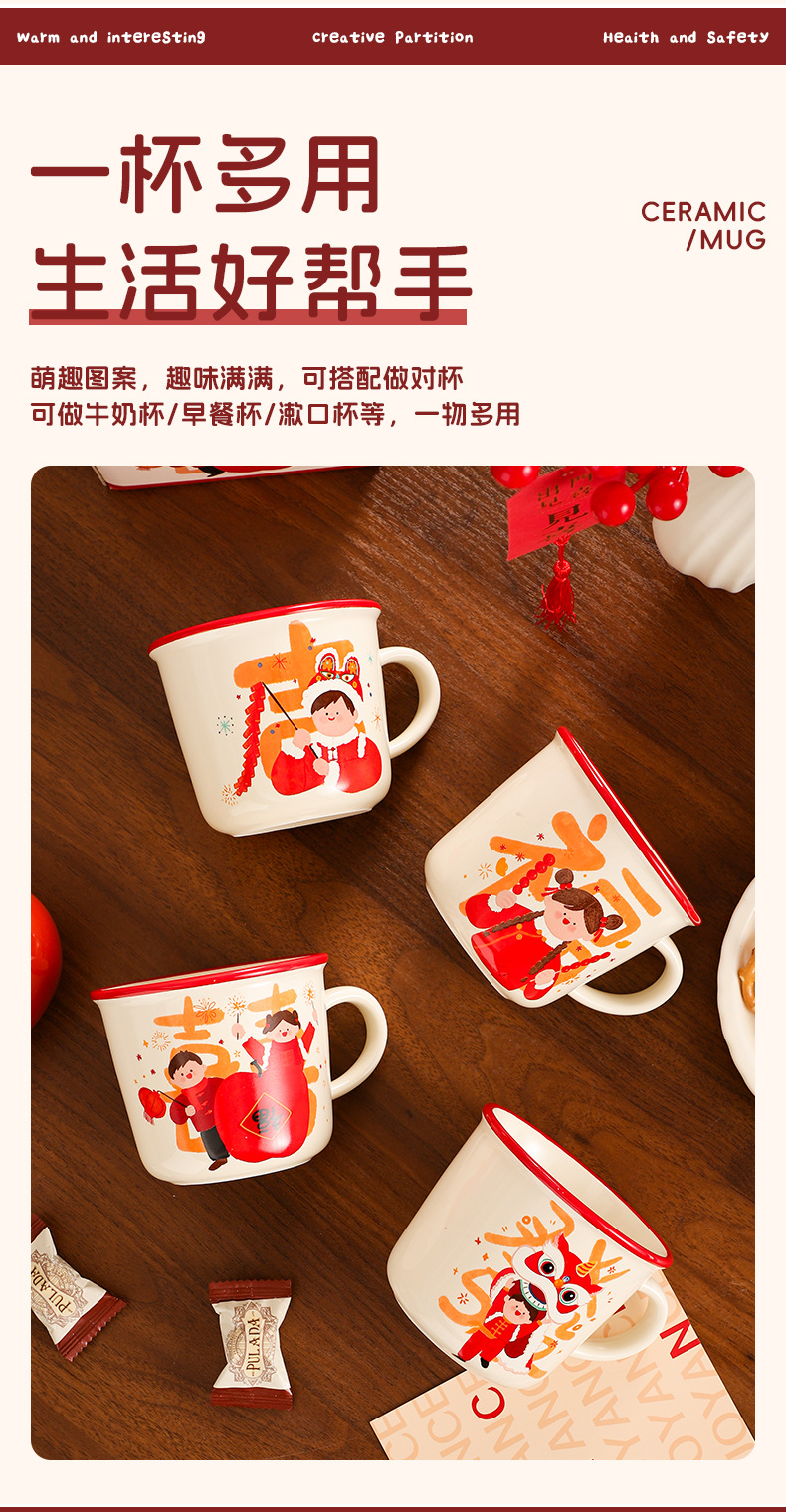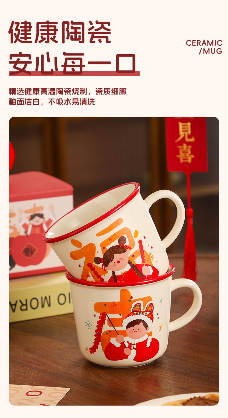 新年喜庆陶瓷杯好寓意马克杯伴手礼带盖家用水杯茶缸新中式搪瓷杯