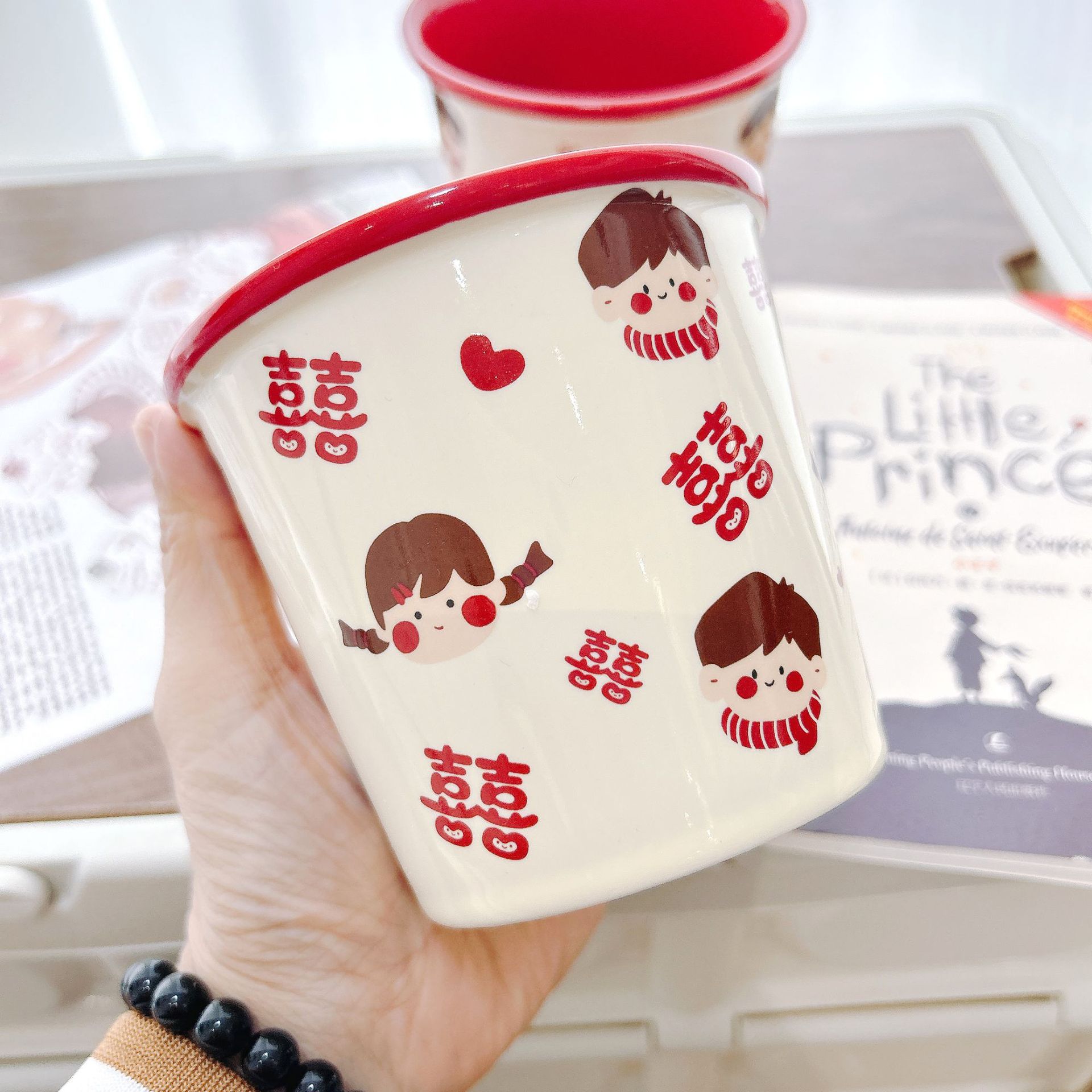 Ins喜字かわいいアニメ男女陶磁器マグカップ結婚式手作りカップ結婚お土産カップルカップ