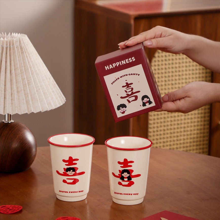 欢喜陶瓷情侣对杯礼盒装结婚喜庆叠杯礼盒伴手礼杯子婚庆影楼礼品
