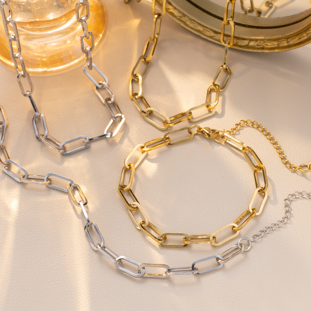 ヨーロッパとアメリカのインスタイル 18K ゴールドステンレス鋼スレッドチェーンロングブレスレットクロスボーダートレンド非退色ジュエリーセットネックレス