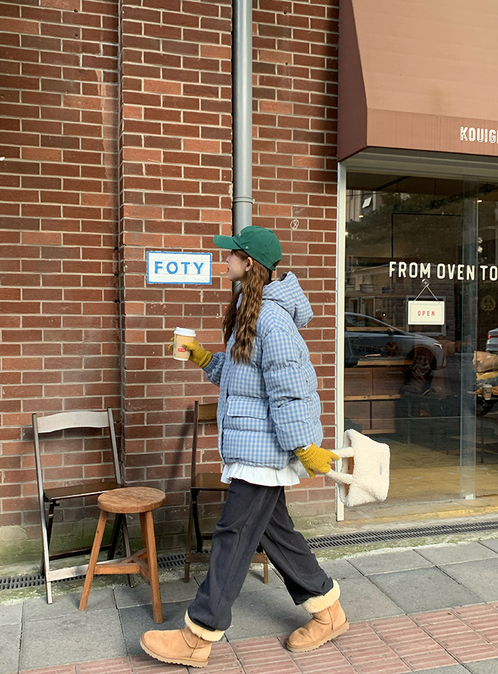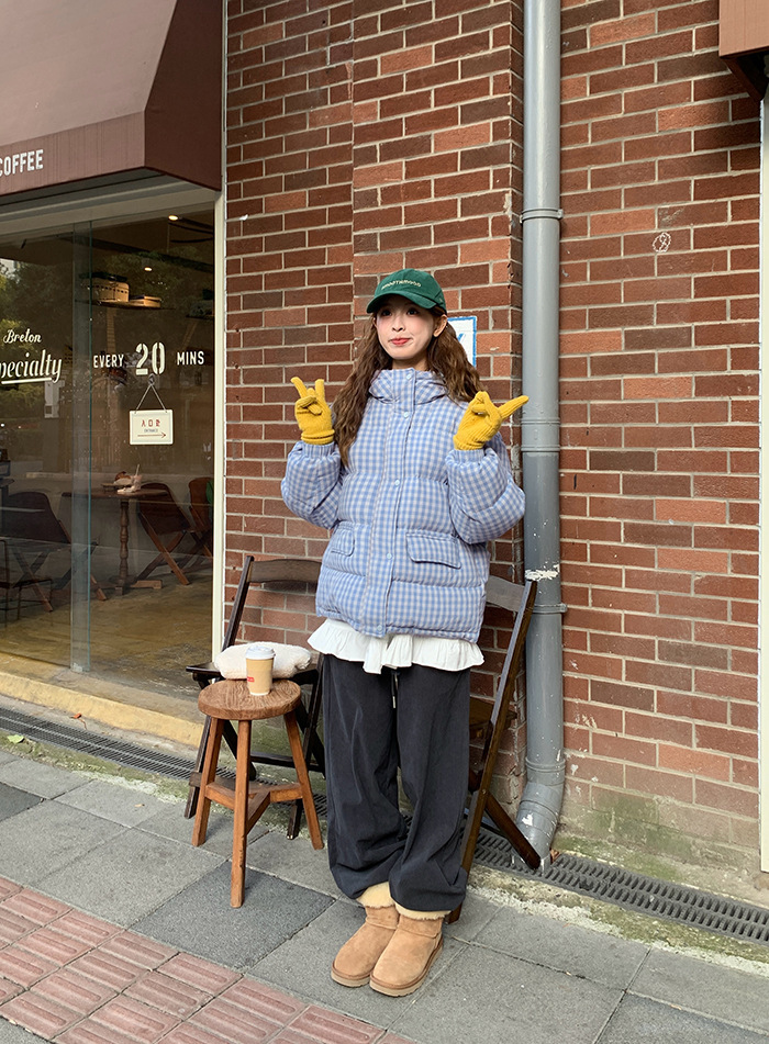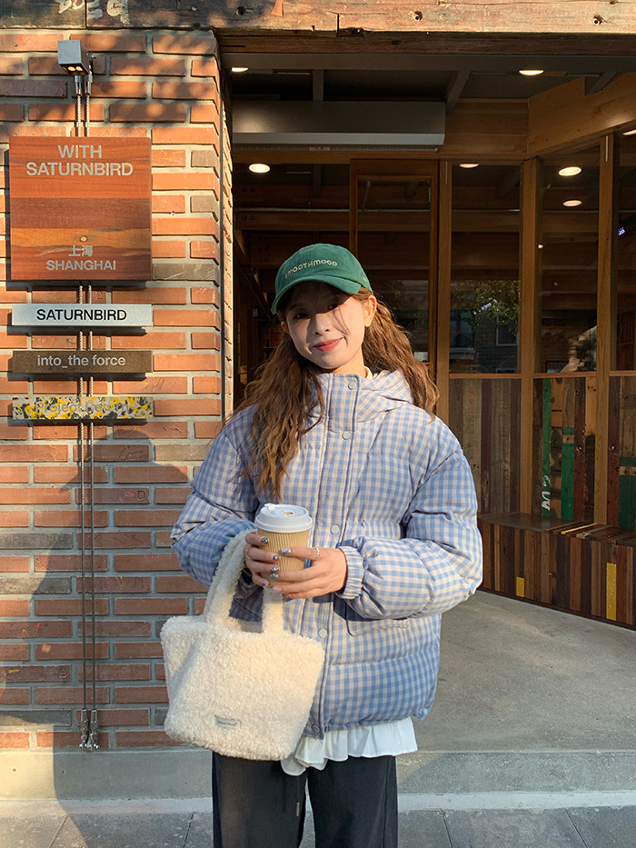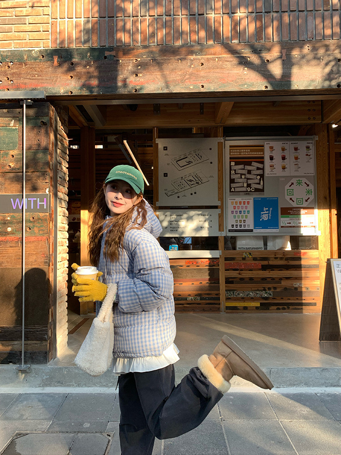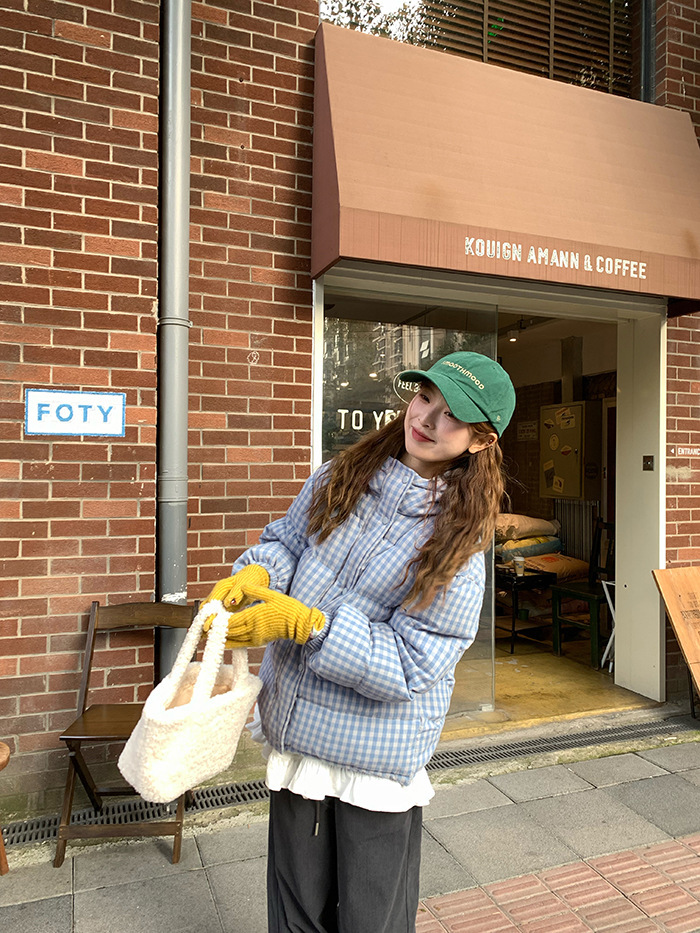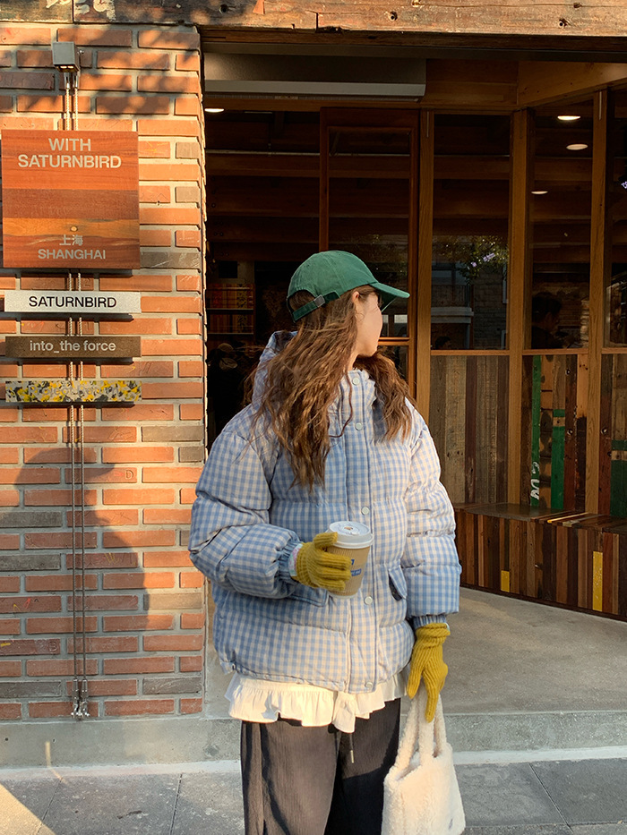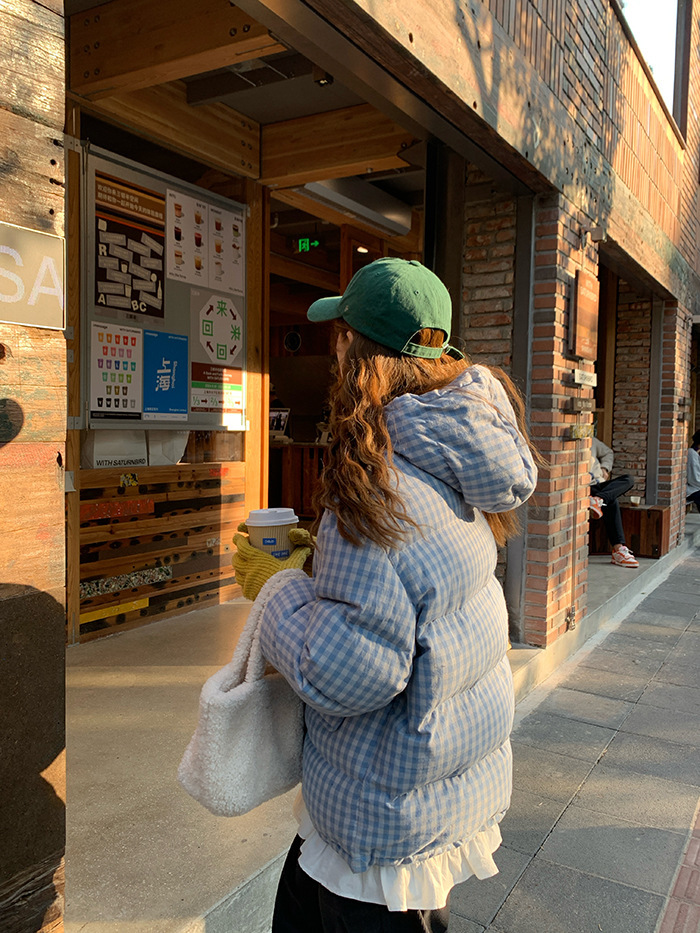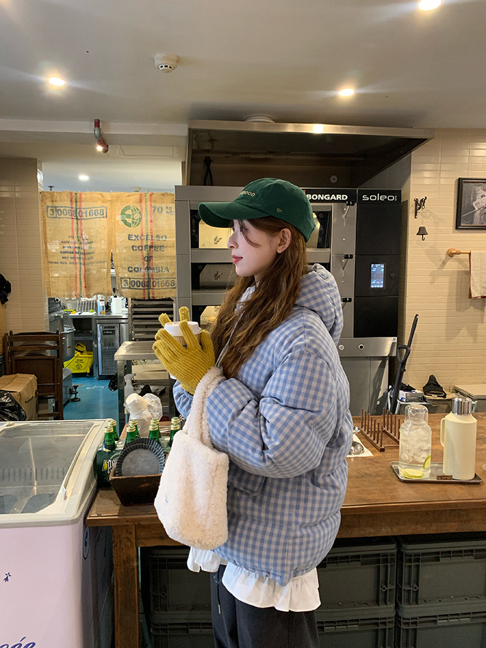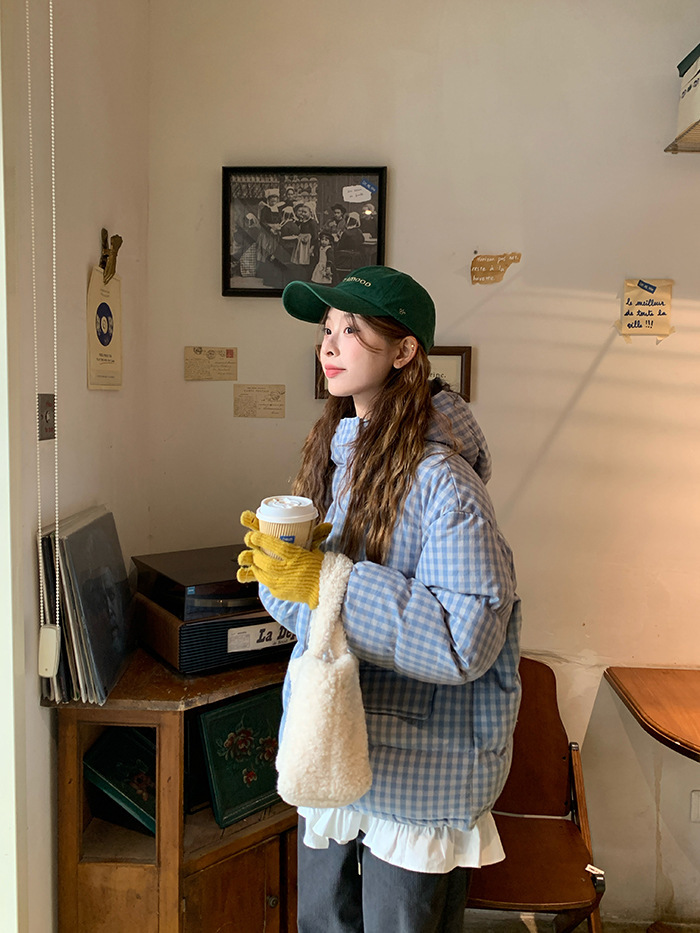2025新款连帽羽绒棉服蓝色格子面包服冬季外套女短款棉服棉衣夹克