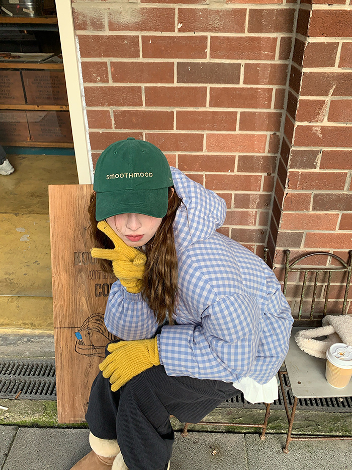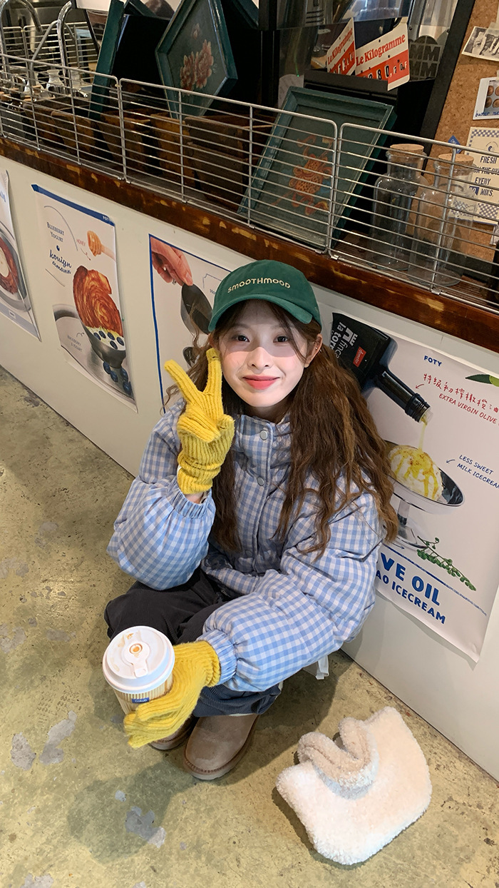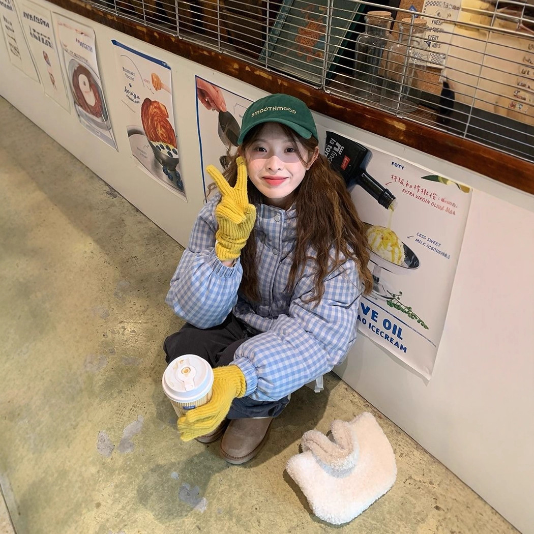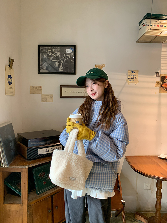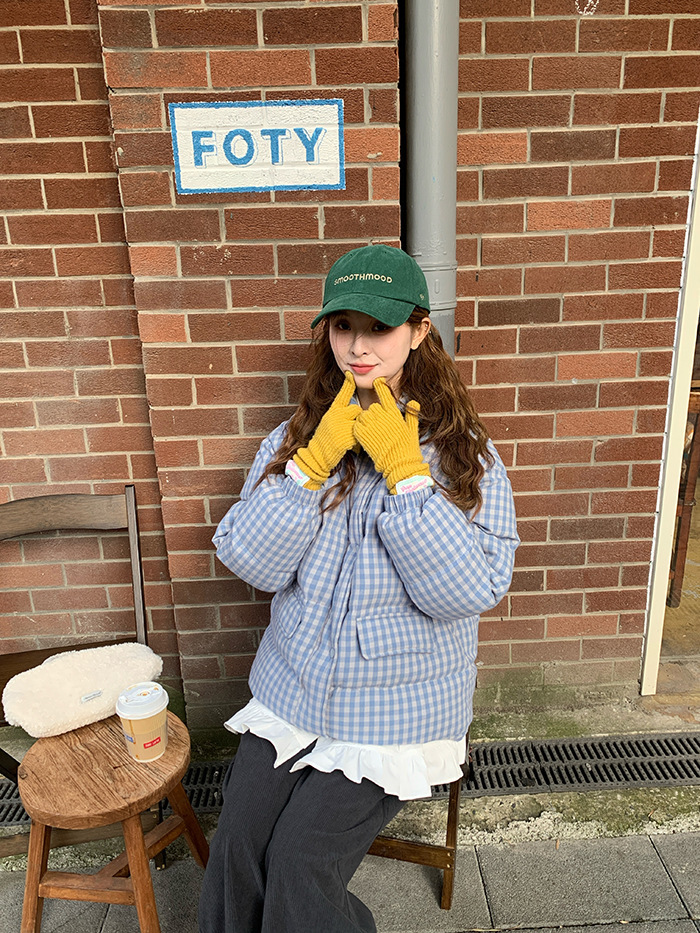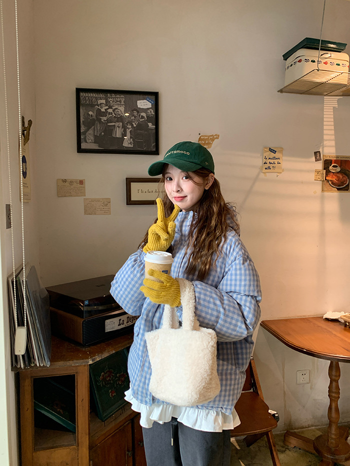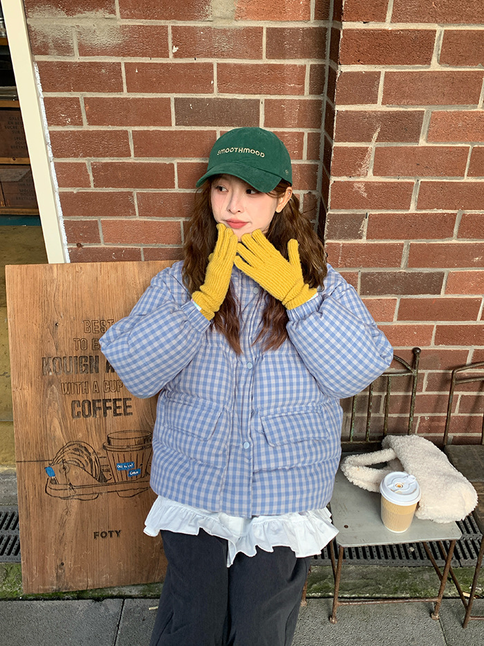 2025新款连帽羽绒棉服蓝色格子面包服冬季外套女短款棉服棉衣夹克