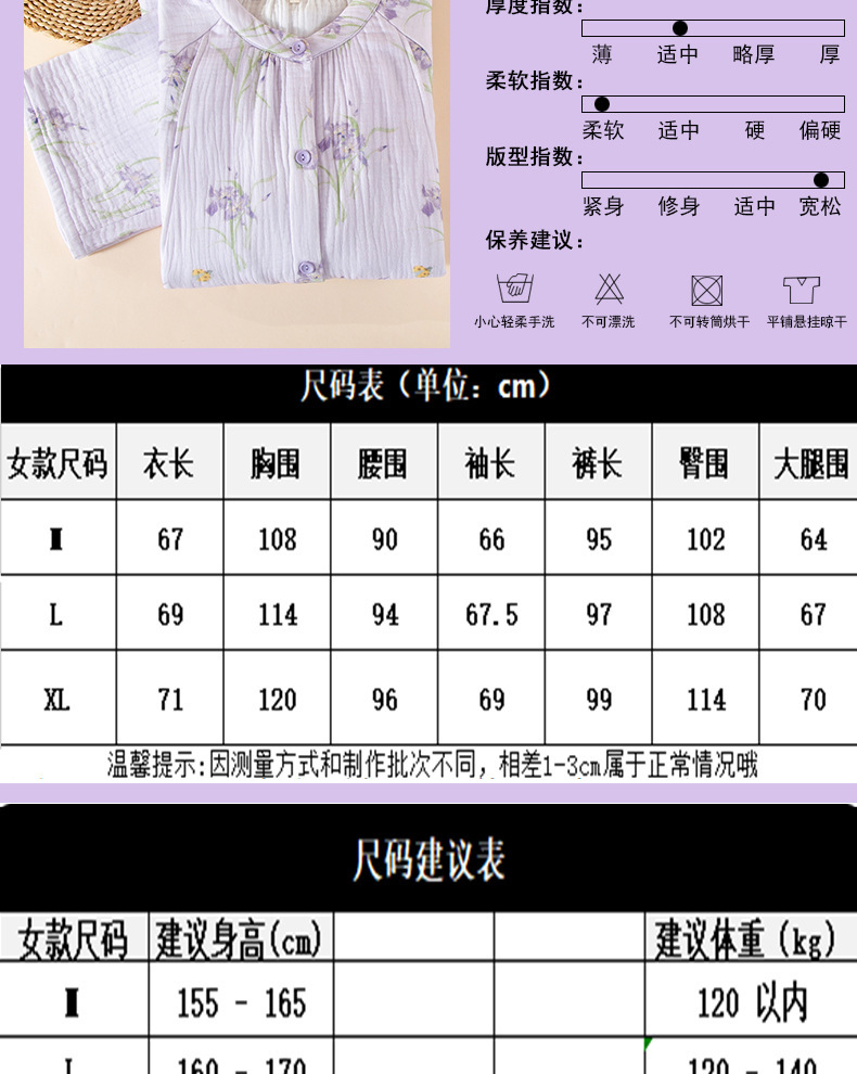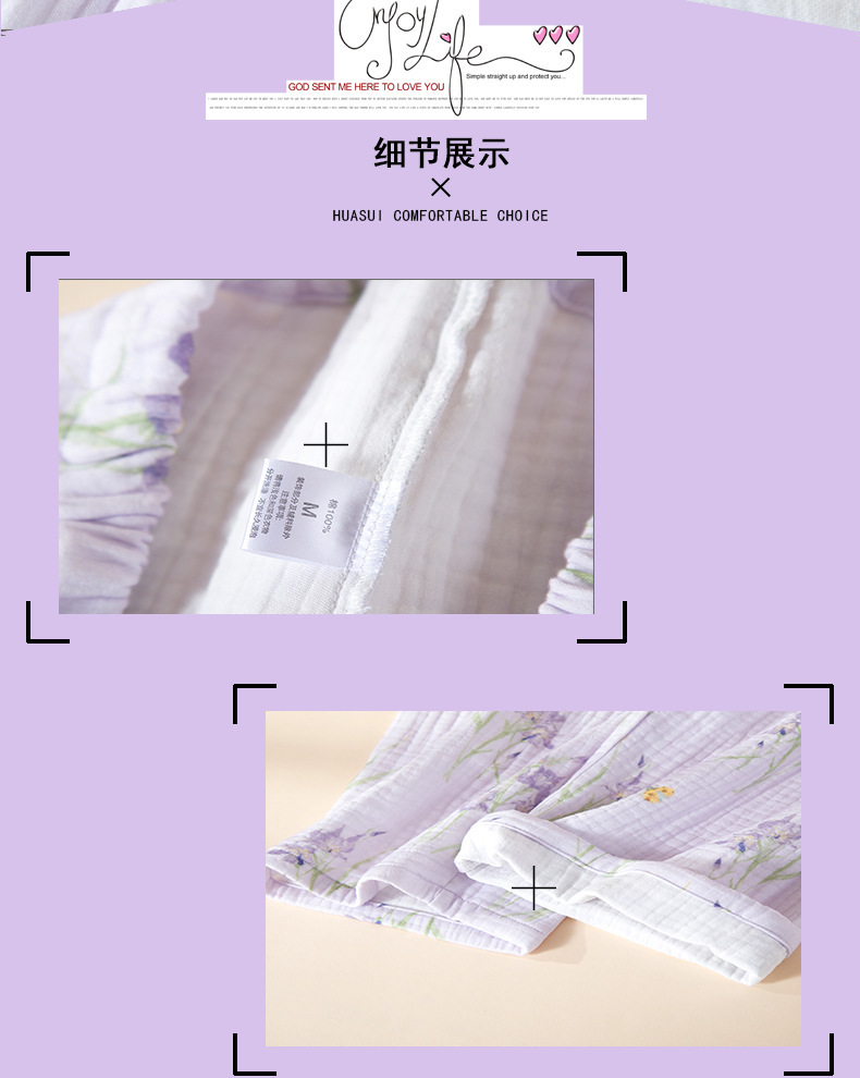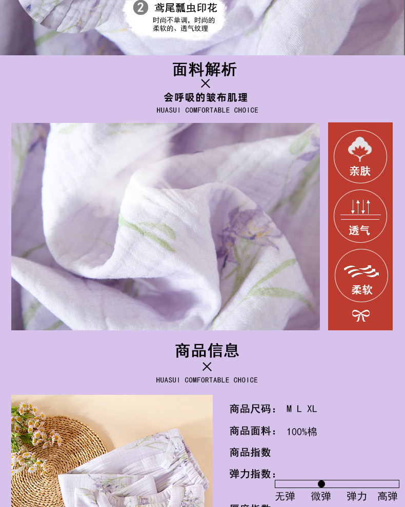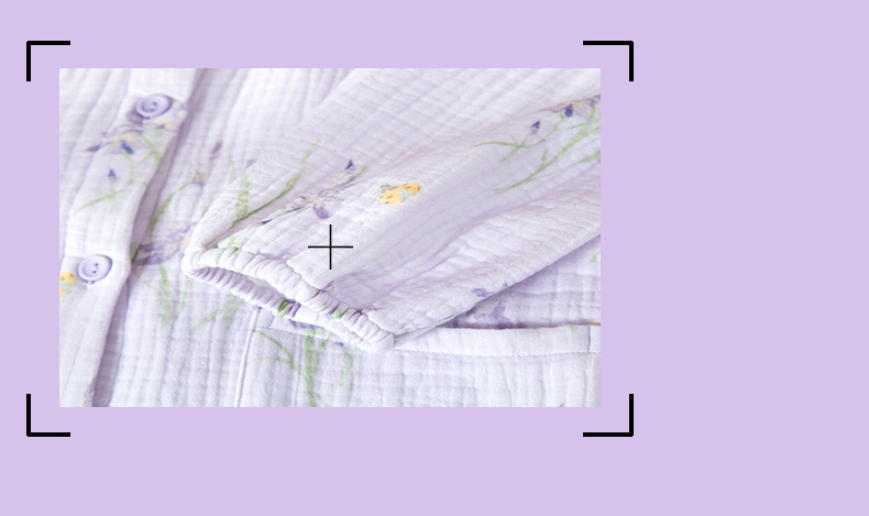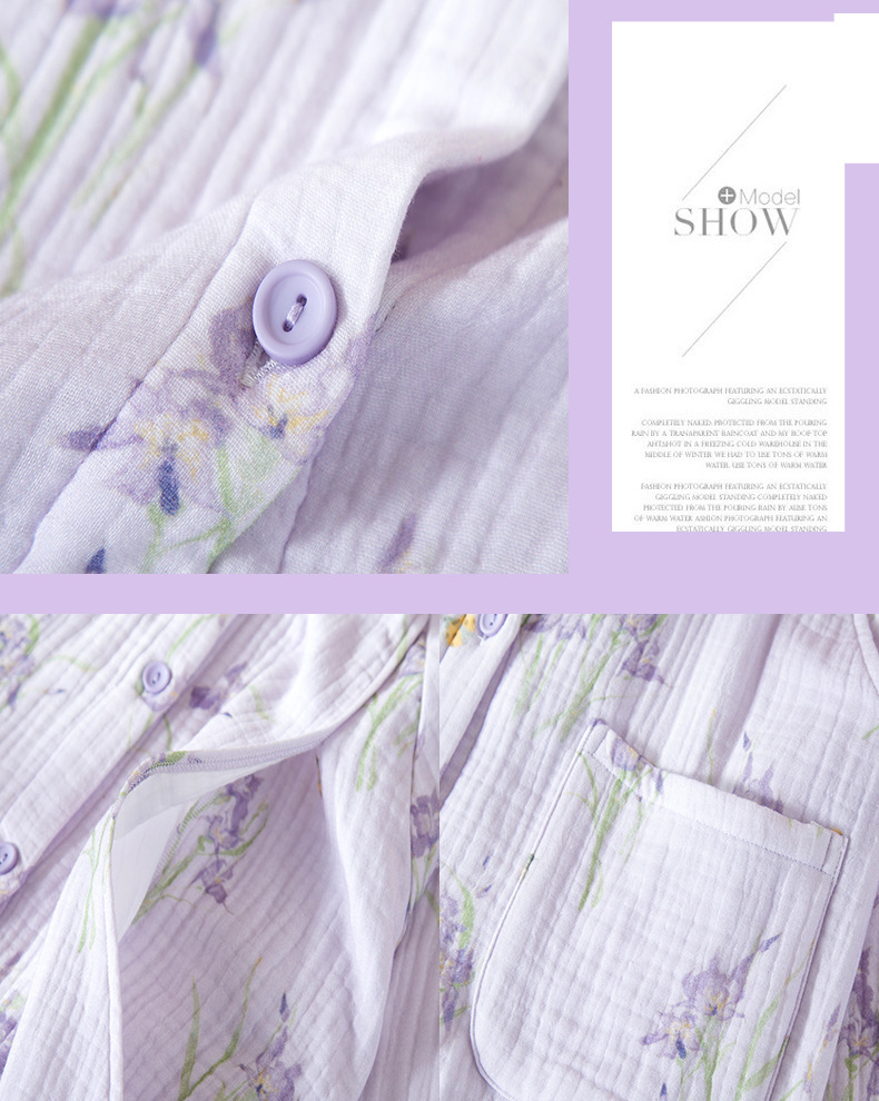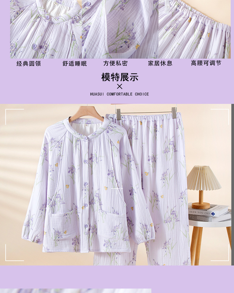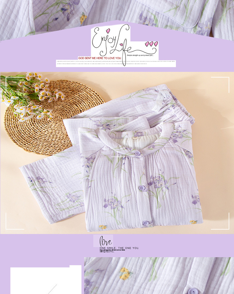 A类纯棉四层皱纱睡衣女春秋冬季鸢尾瓢虫翻领常规家居服套可外穿