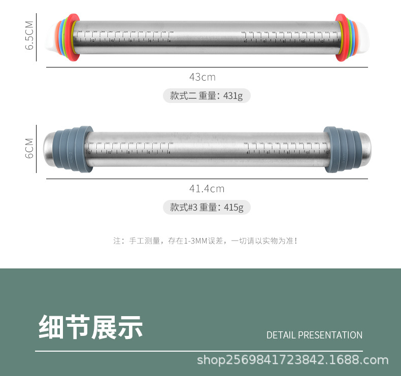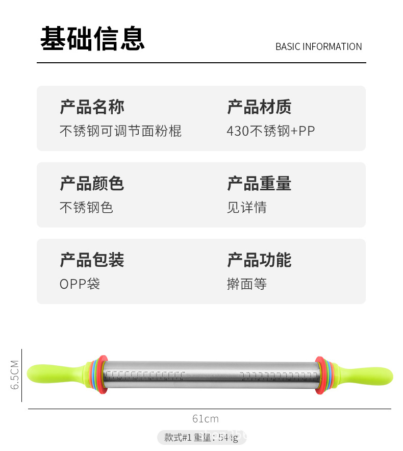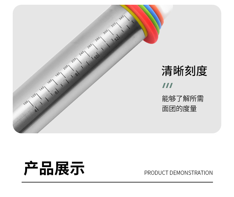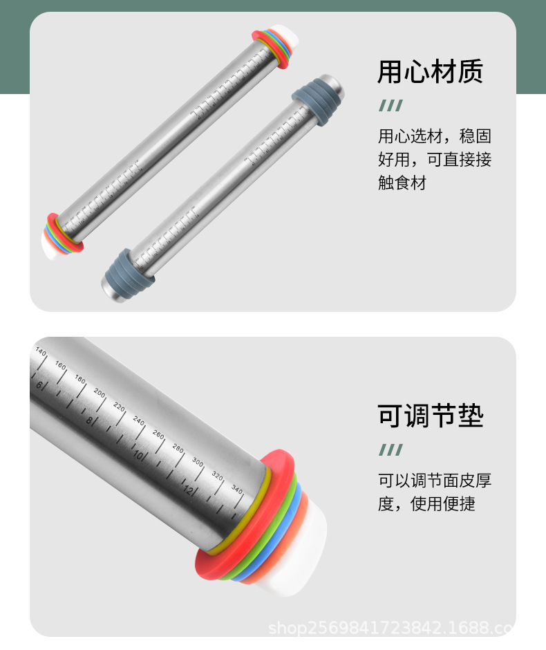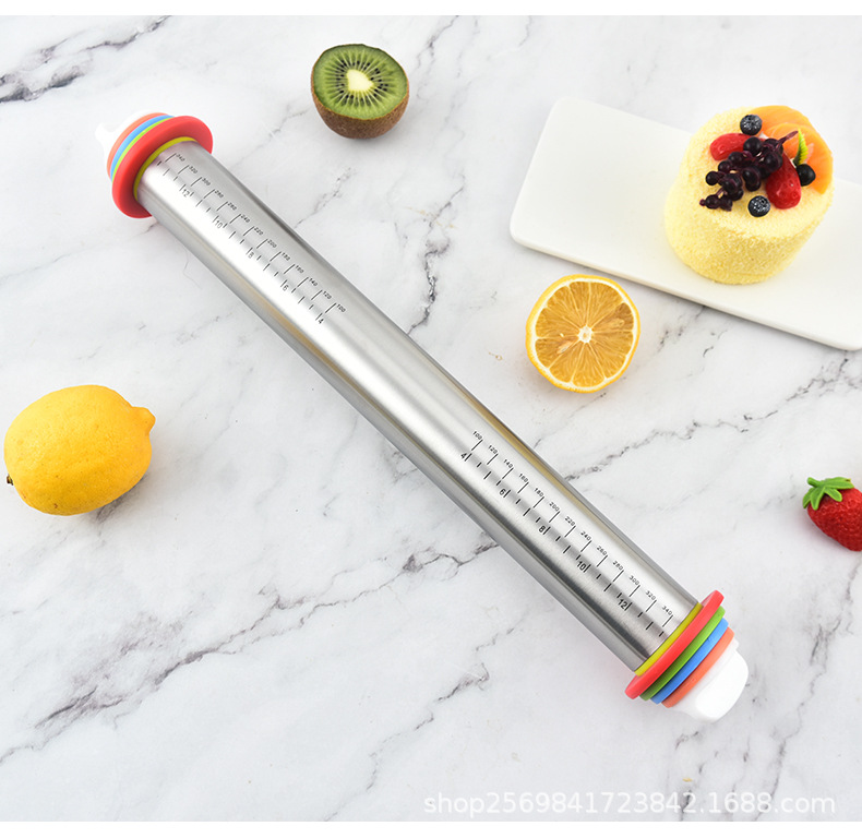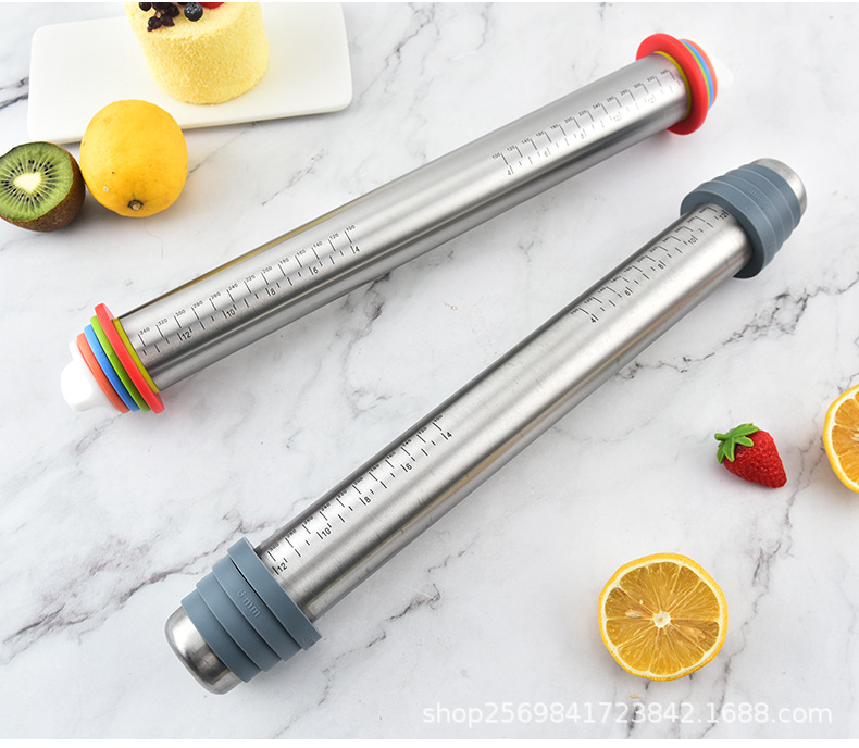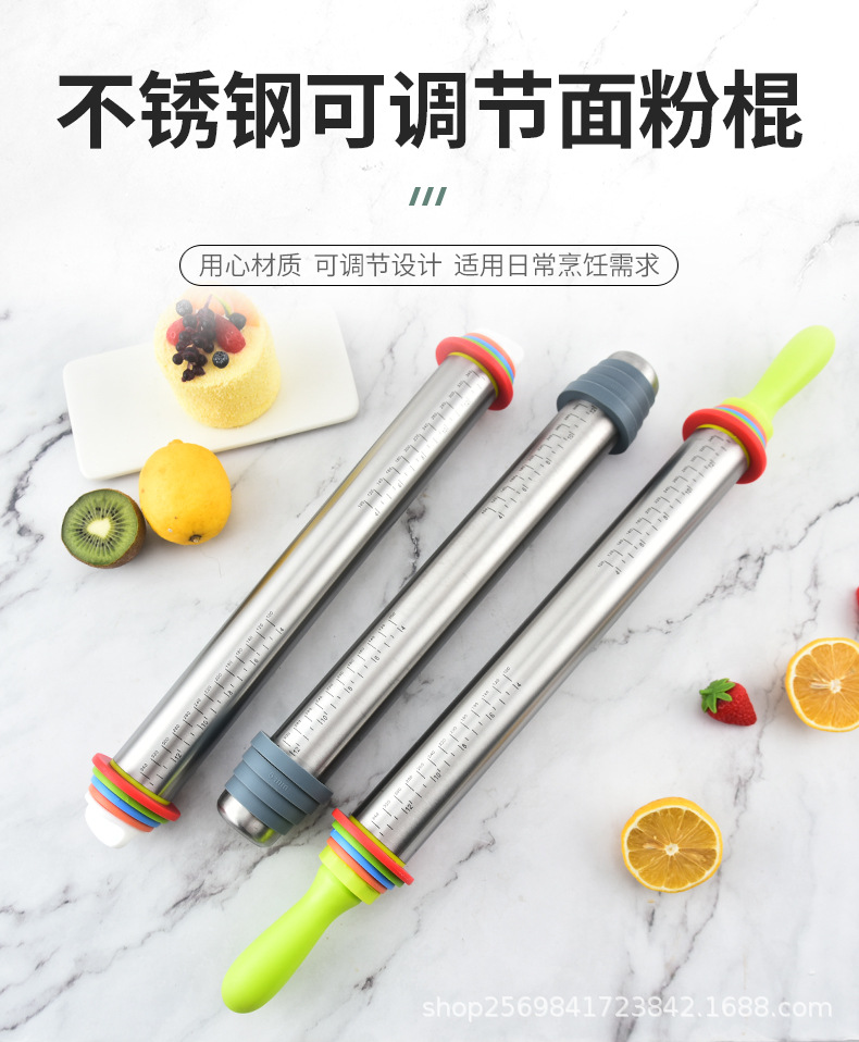 家用不锈钢擀面杖带硅胶圈可调节厚度面粉棍可变厚度一体滚轮滚筒