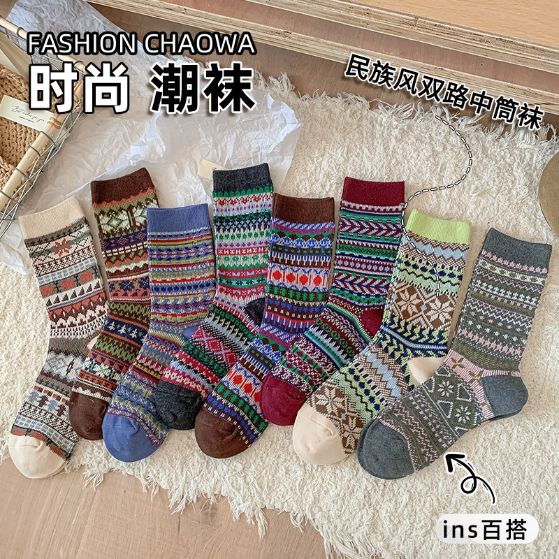 费尔岛复古中筒袜子女秋冬季保暖撞色堆堆袜民族风双针双路长筒袜