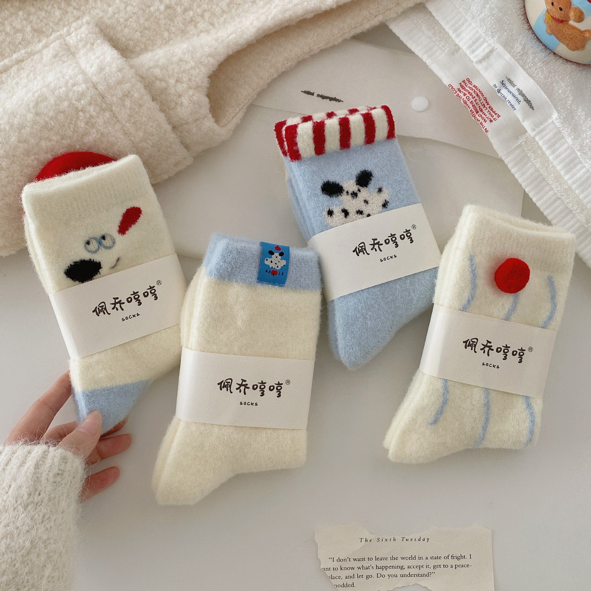 澳绒小熊袜子女堆堆袜秋冬加绒加厚保暖可爱卡通波点水貂绒中筒袜