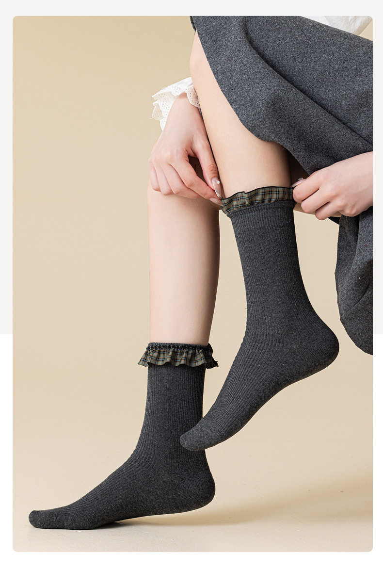秋冬新款饰品袜子女灰蓝花边女士无骨中筒袜ins风韩版潮流堆堆袜