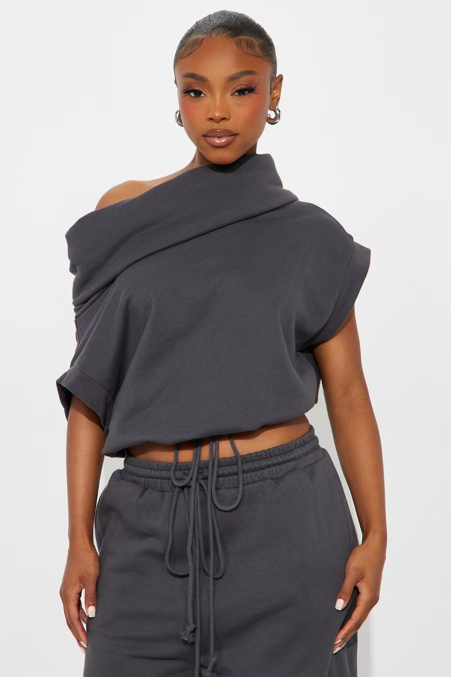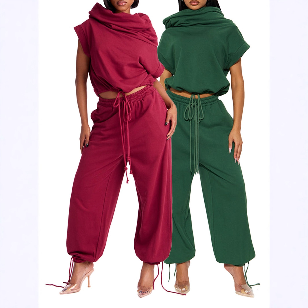 跨境亚马逊2025秋季欧美女式休闲堆领短袖露脐系绳高腰松紧裤套装