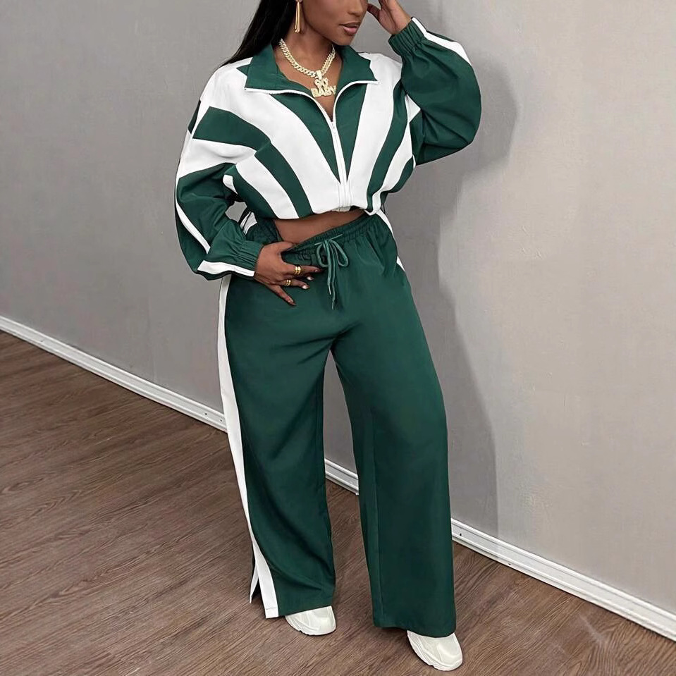 跨境欧美2025新款女装个性街头撞色抽绳上衣拉链休闲长裤两件套