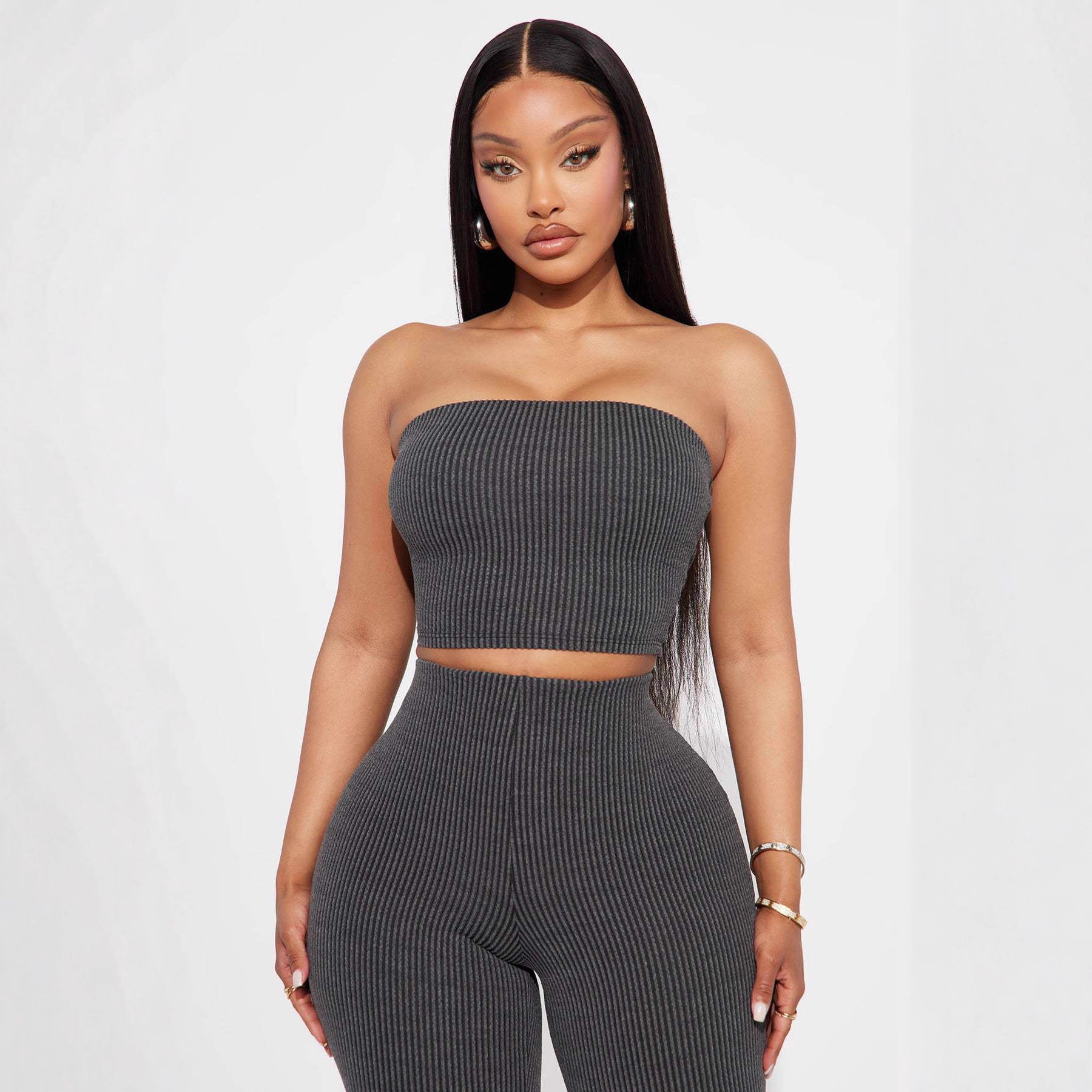 跨境欧美新款女装时尚抹胸露肩背心上衣齐腰包臀坑条长裤套装女装