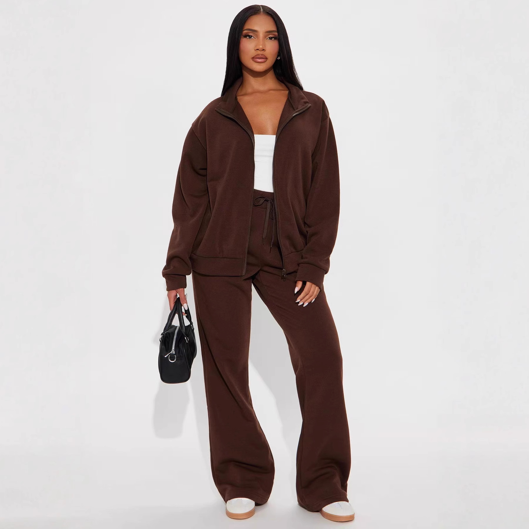 欧美跨境2025秋季女士立领拉链套装时尚休闲两件长裤外套显瘦女装