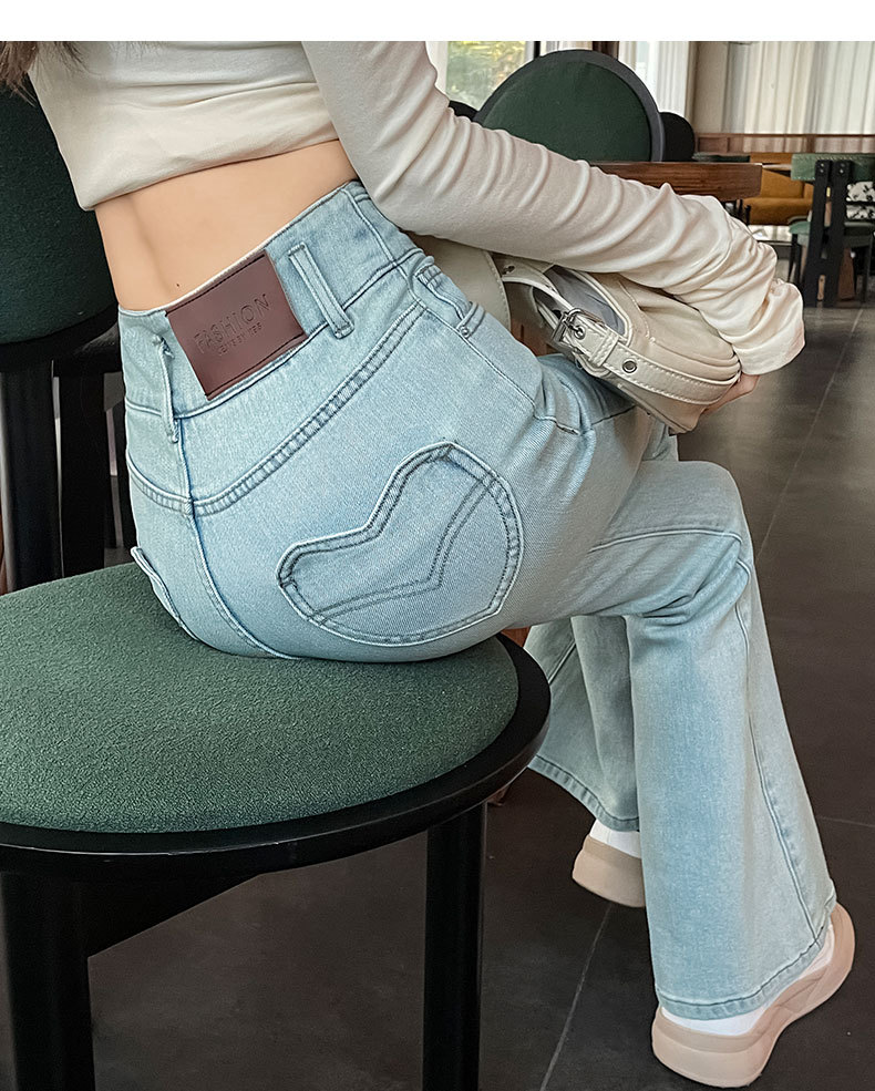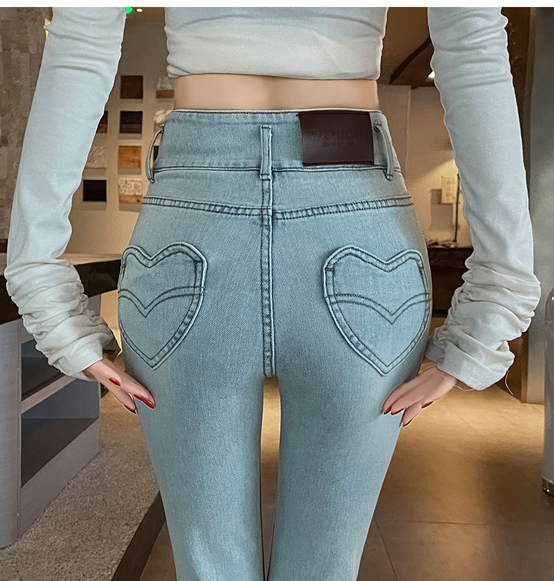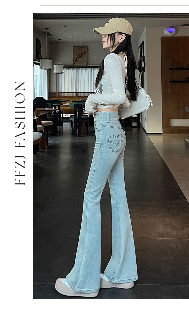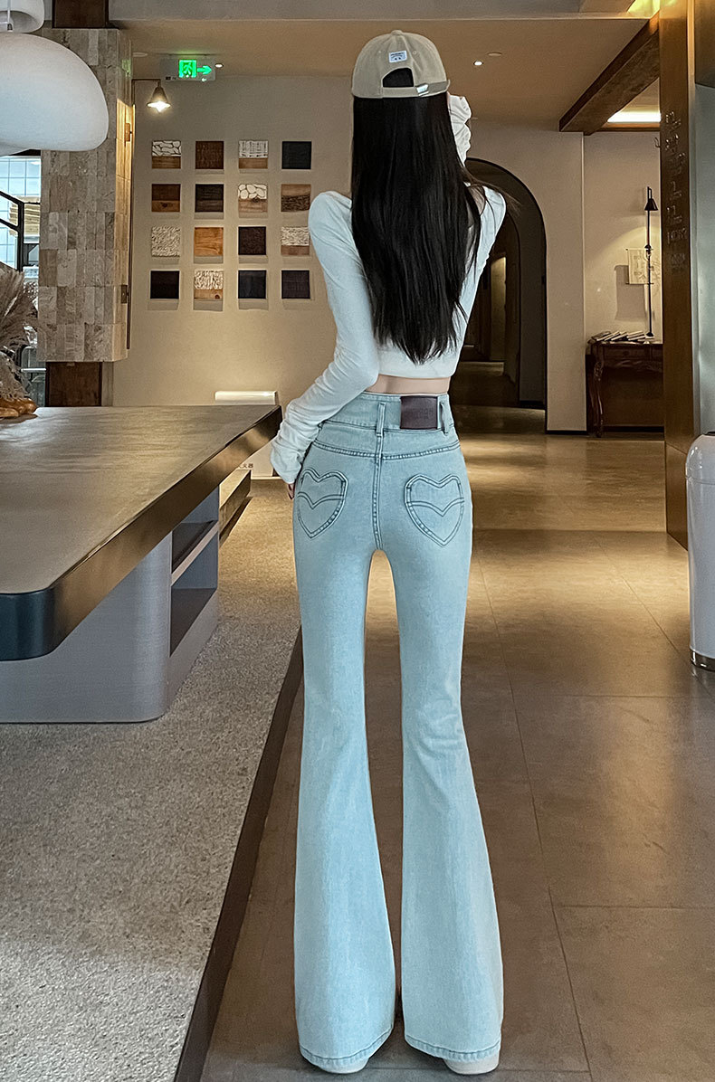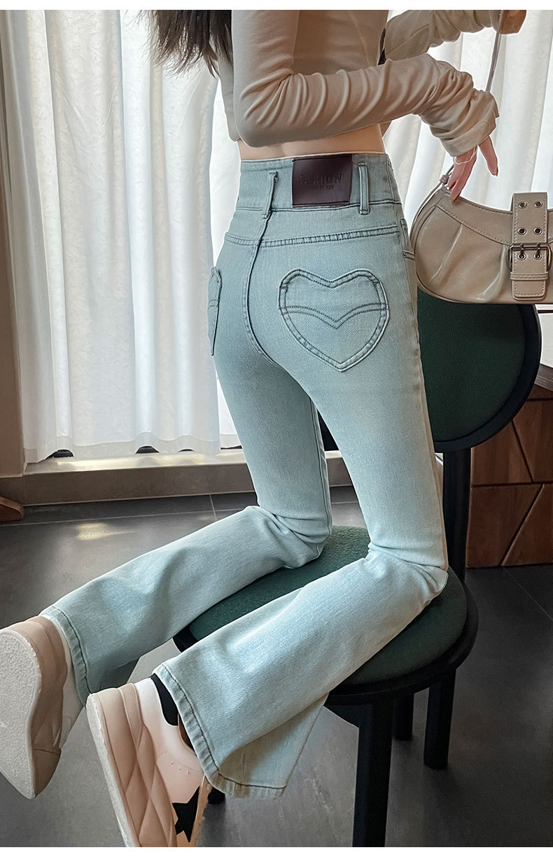 浅蓝色微喇加绒牛仔裤女秋冬季2025新款高腰显瘦爱心设计喇叭裤子