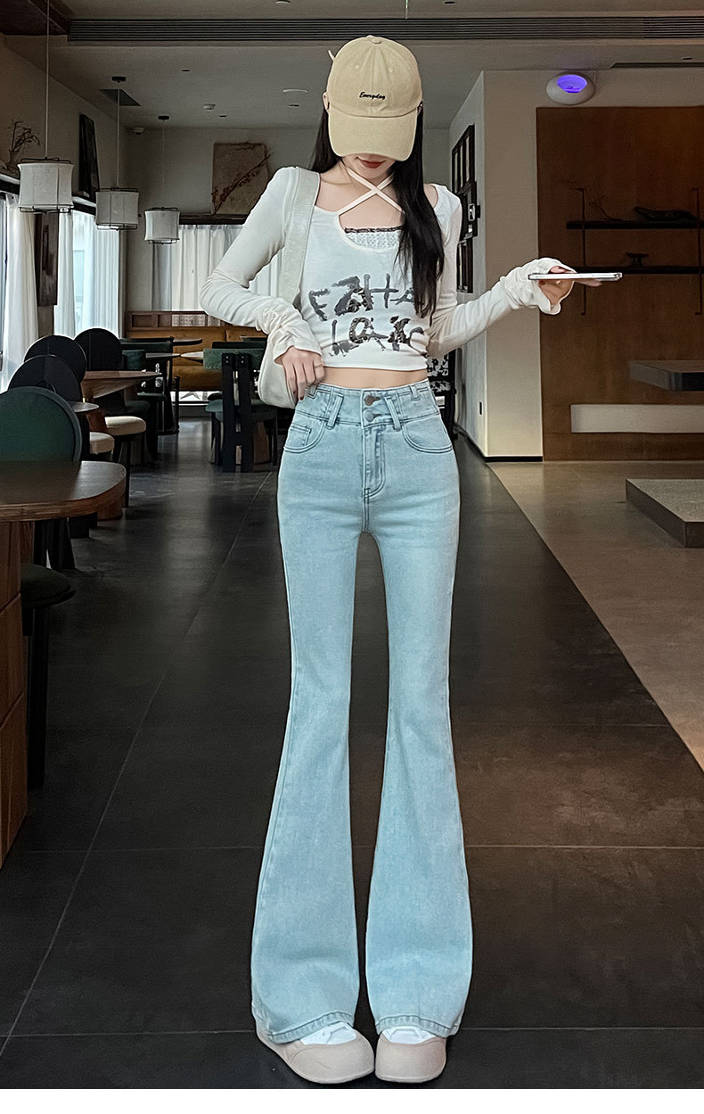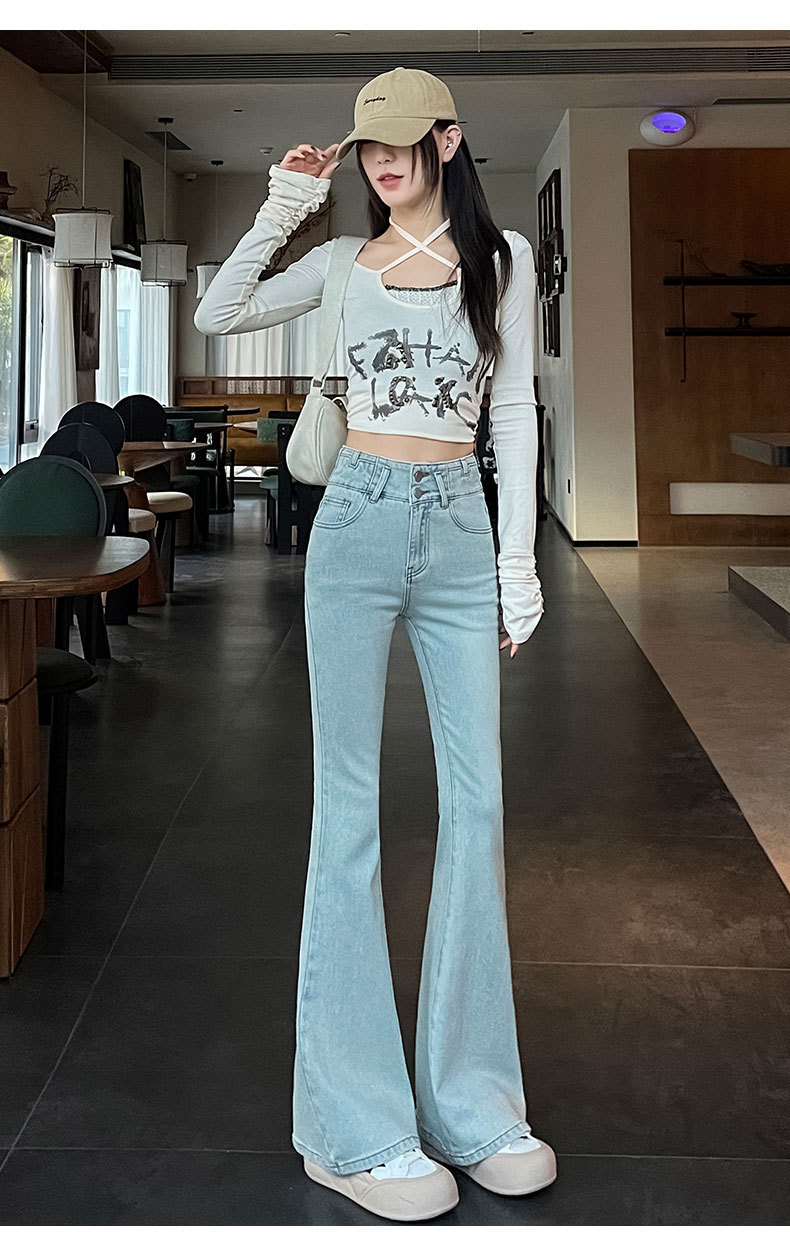 辣妹美式做旧牛仔微喇裤女年春秋新款高腰修身显瘦弹力喇叭裤