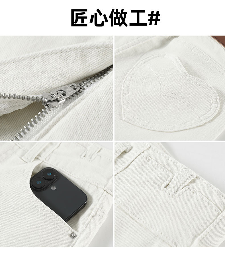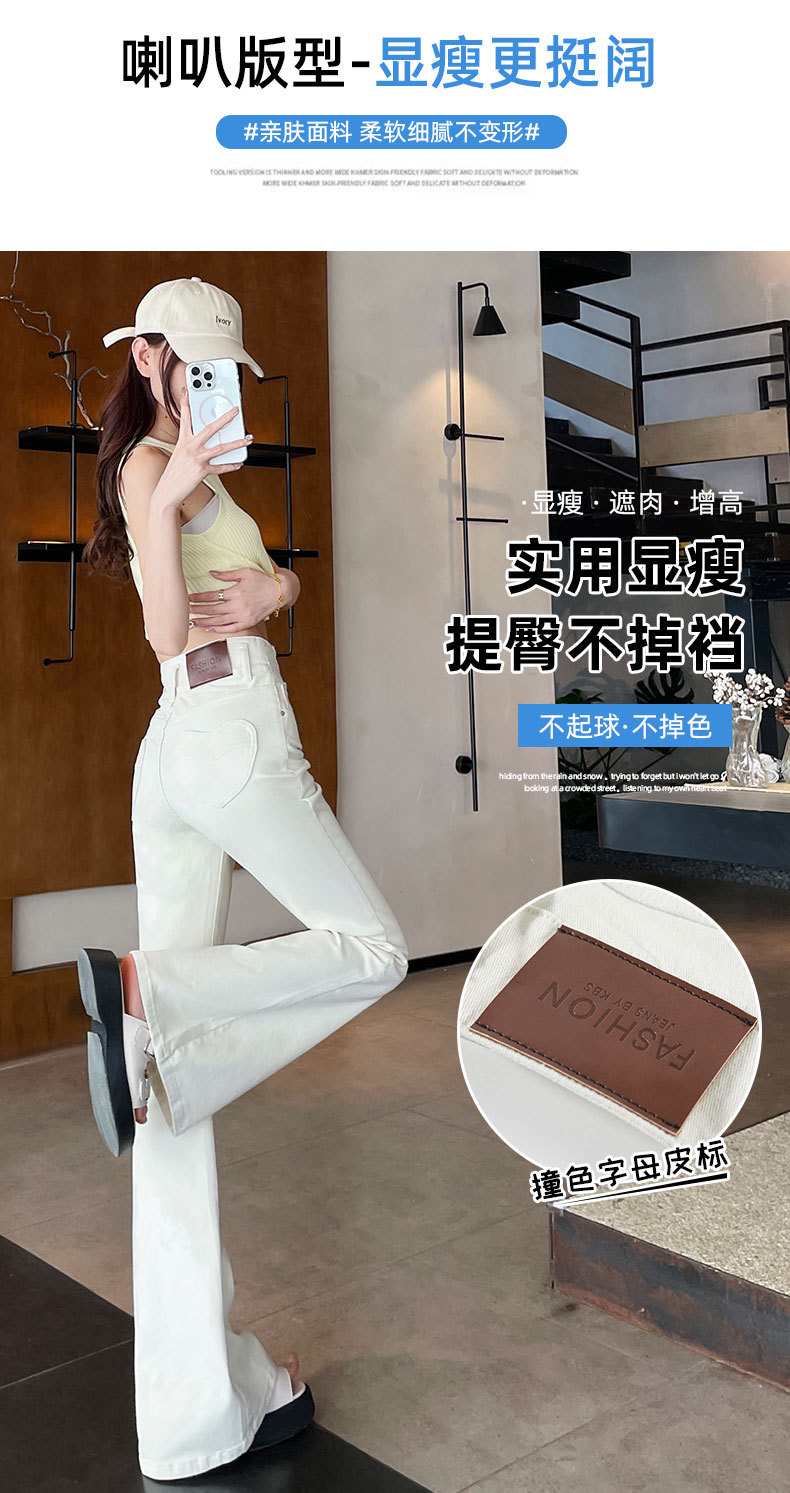 爱心口袋米白色微喇加绒牛仔裤女秋冬季2025新款高腰修身喇叭裤子