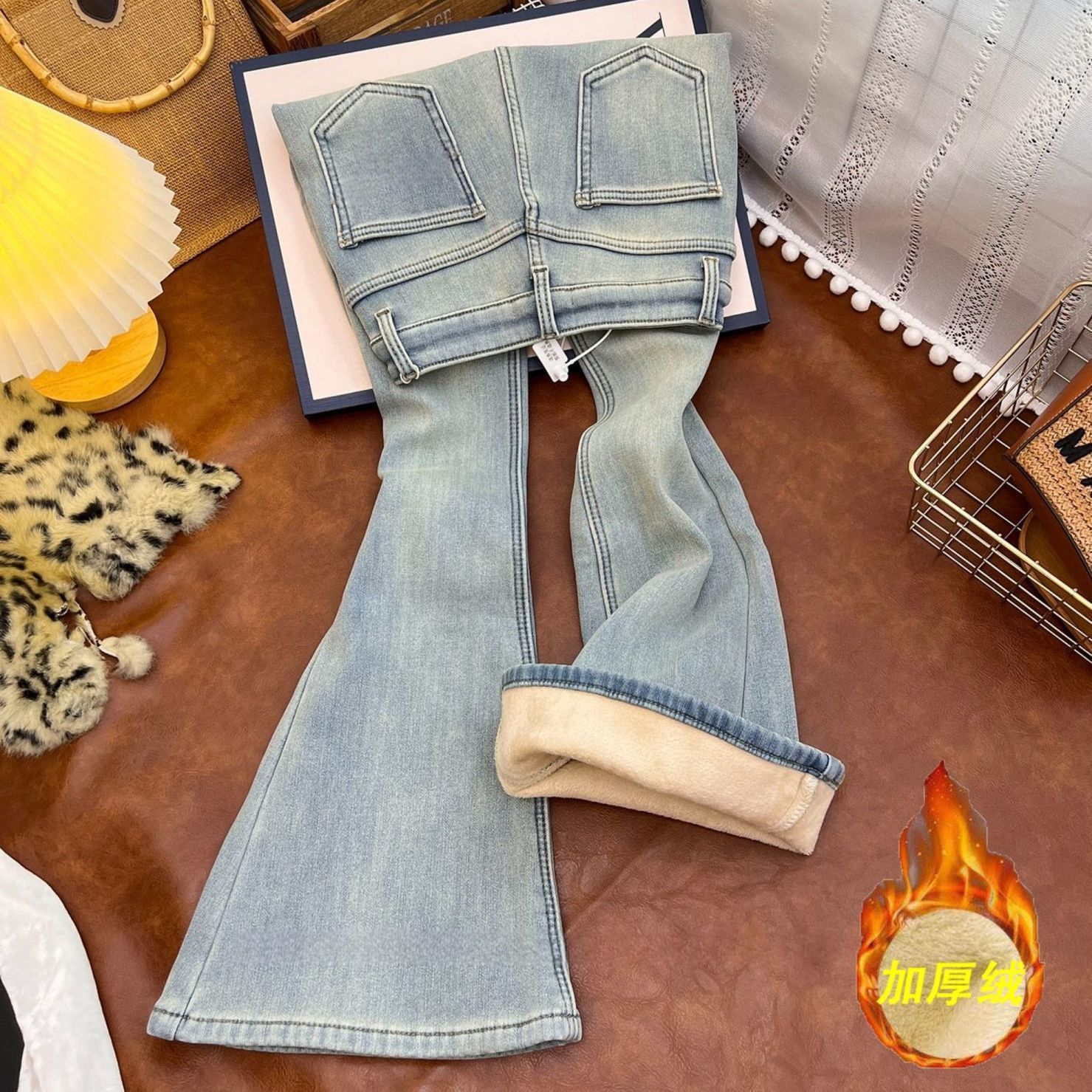 浅蓝色大码加绒加厚微喇牛仔裤女2025秋冬新款高腰显瘦弹力喇叭裤
