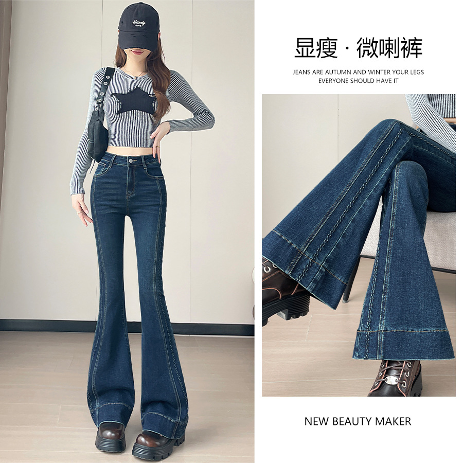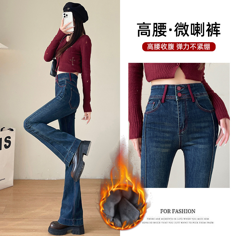 喇叭裤女修身高腰牛仔裤2025冬季加绒爆款修身梨形微胖微喇拖地裤