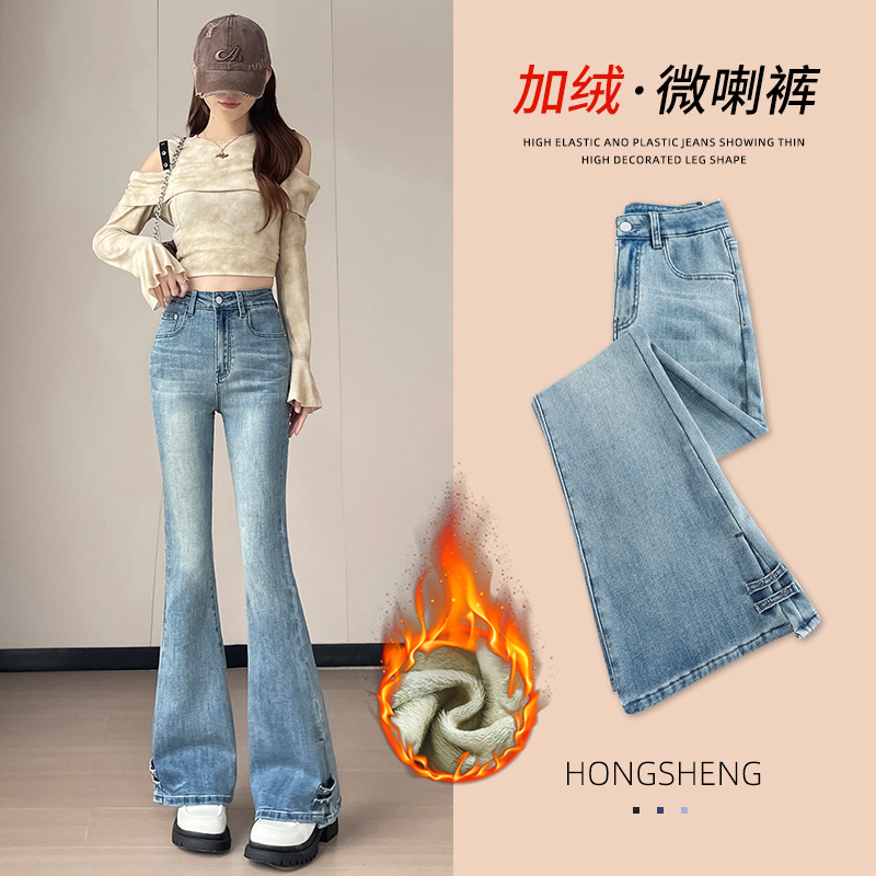 浅蓝色开叉紧身微喇加绒牛仔裤女冬季2025新款高腰显瘦马蹄喇叭裤