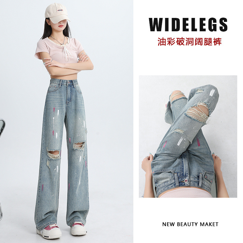 穴の狭い版の広脚のジーパンの女性の夏の薄い金の2024年の新型の高腰のゆったりしているファッションのペンキのストレートなズボン