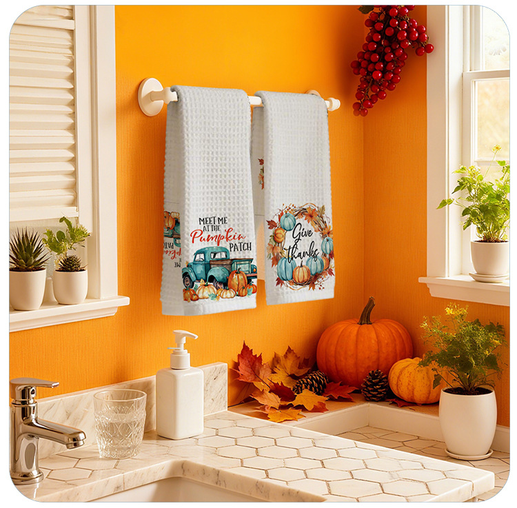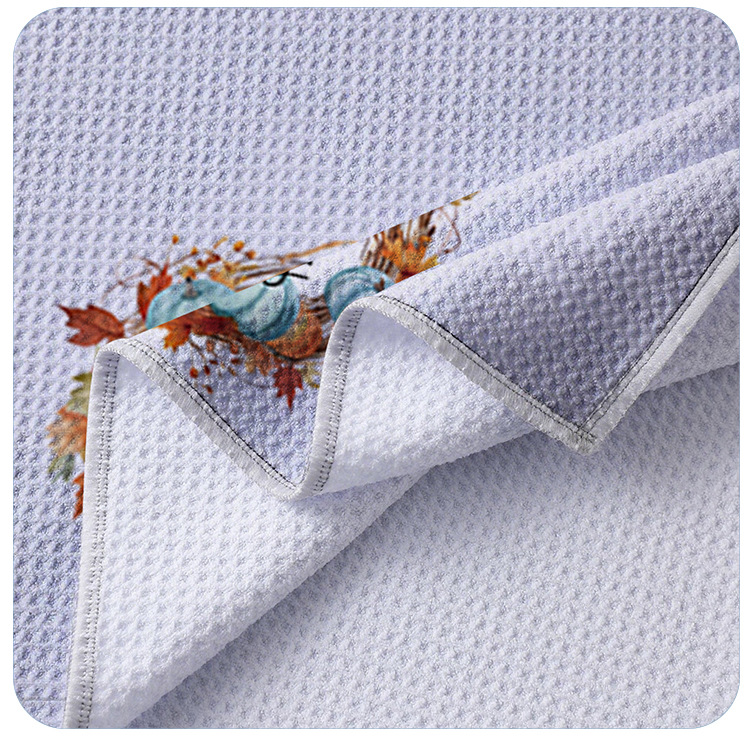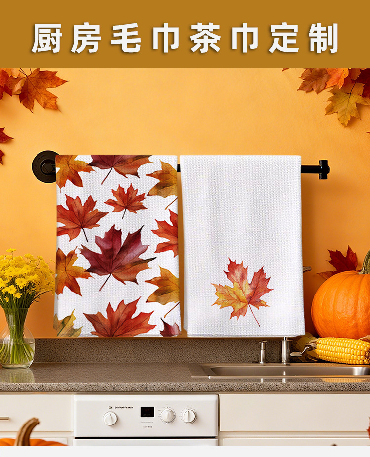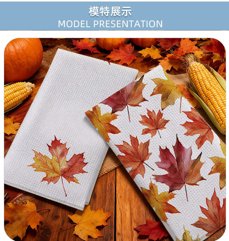 跨境感恩节印花厨房毛巾吸水不掉毛秋季南瓜枫叶华夫格茶巾洗碗巾