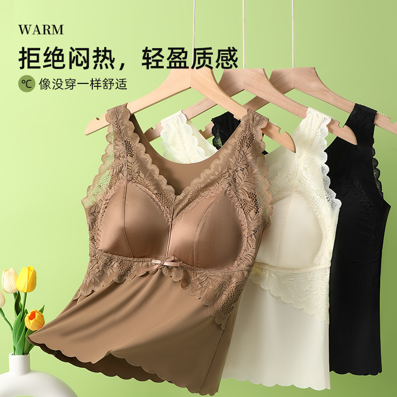 829#轻奢蕾丝缎面德绒磨毛保暖背心无痕加厚带固定胸垫内搭打底女