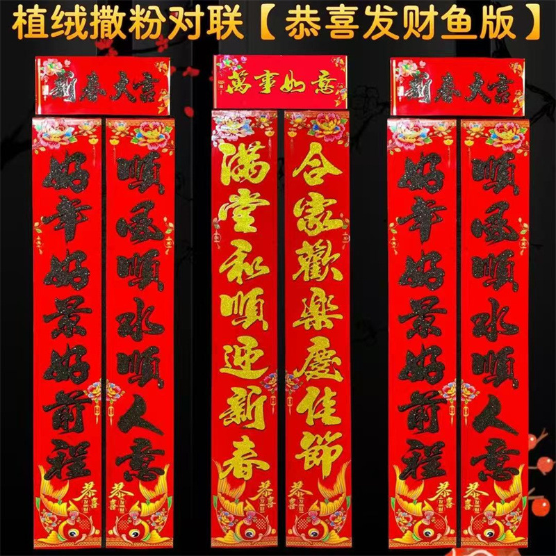 新款植绒撒粉对联恭喜发财鱼版七字言门房对子洒金农村大门对联