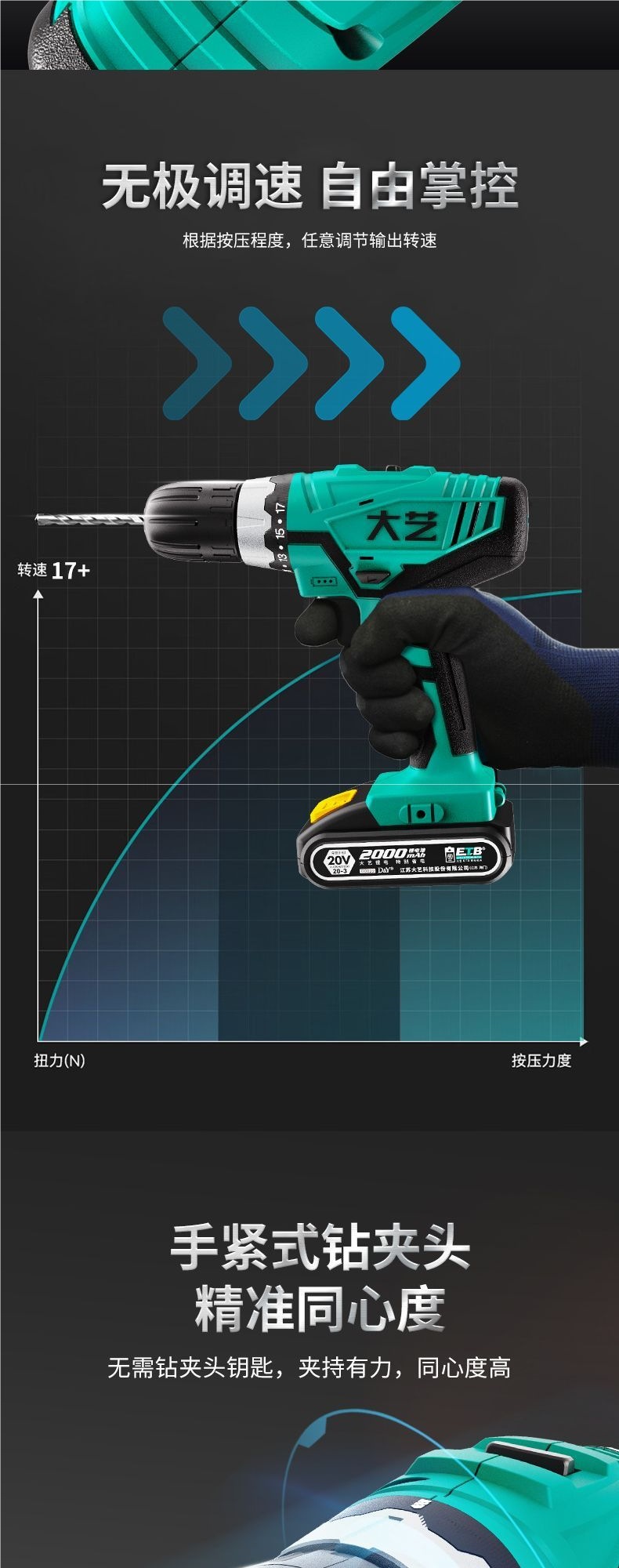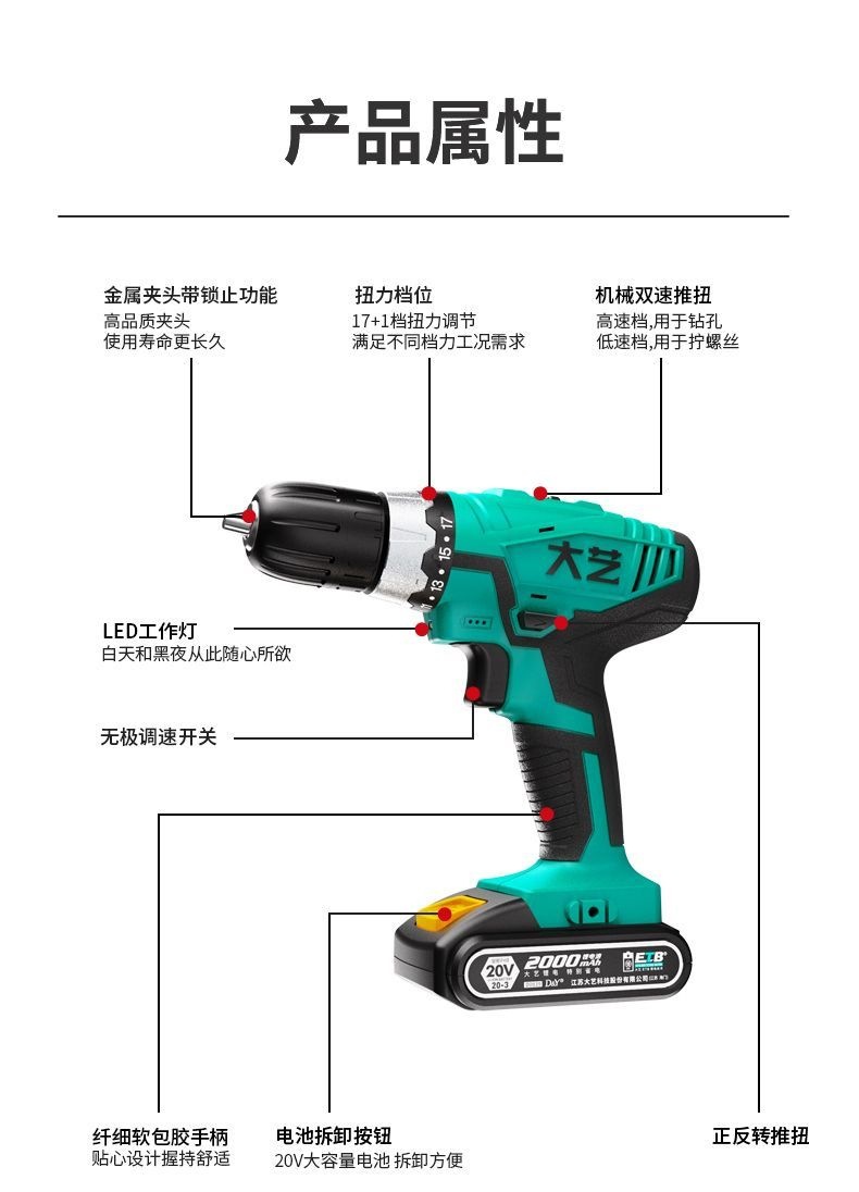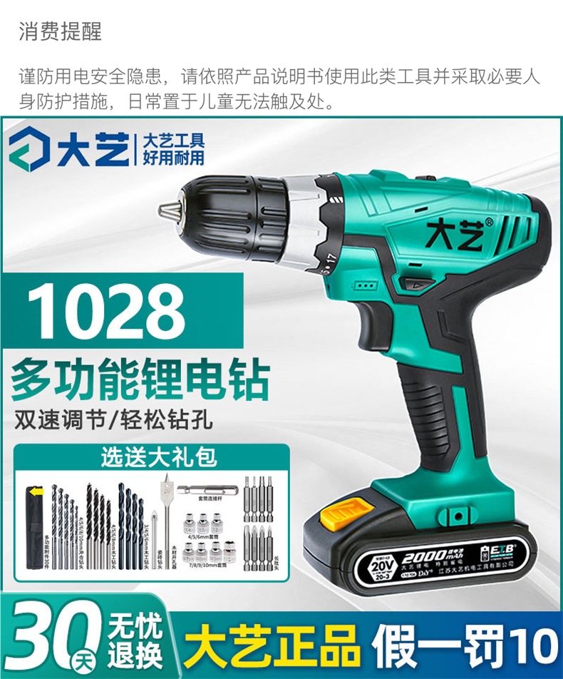 大艺原装正品充电式电钻家用锂电双速大扭矩充电钻多功能手电钻有