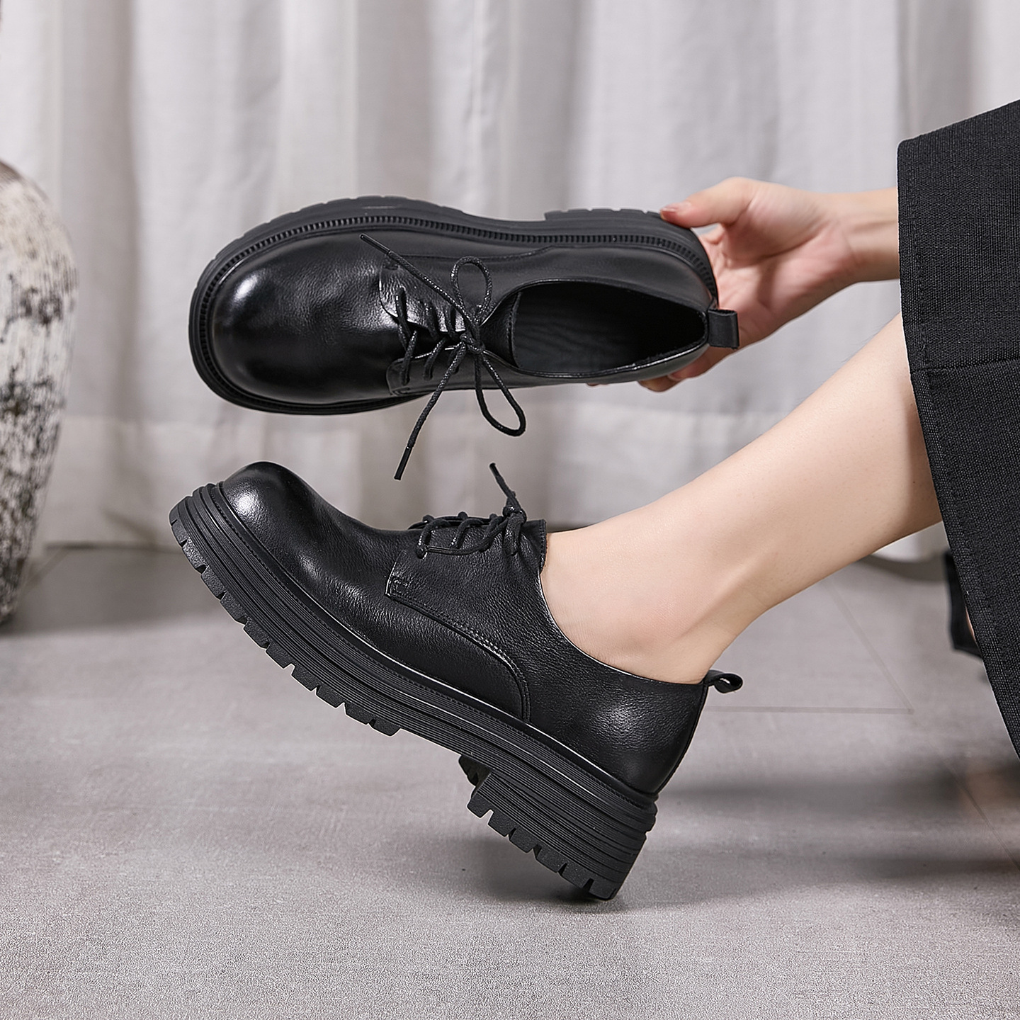 东莞外单乐福鞋复古真皮厚底水洗皮新款圆头系带百搭休闲粗跟单鞋