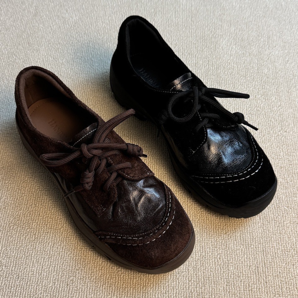 水洗二层牛皮版英伦复古圆头系带乐福鞋通勤百搭粗跟小皮鞋女单鞋