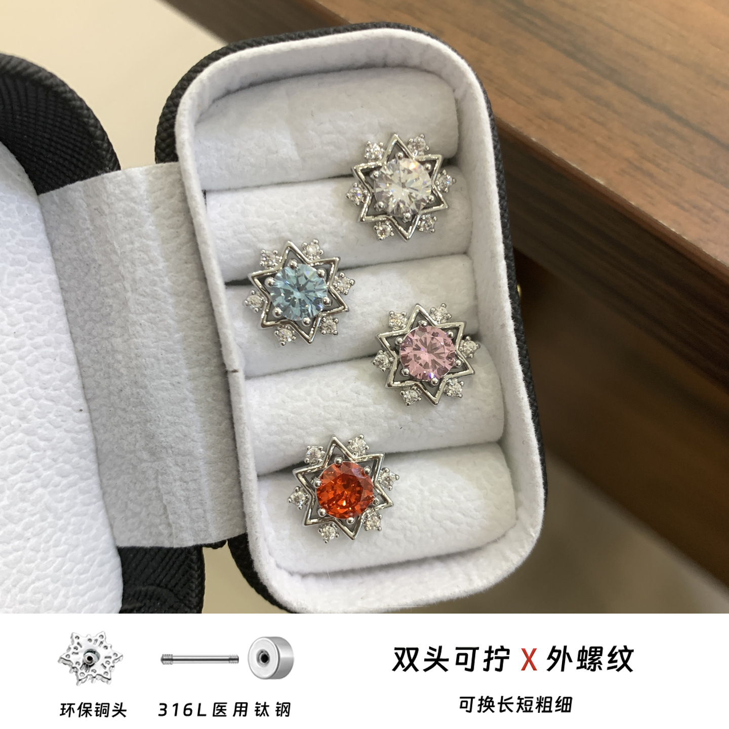 316L钛钢耳骨钉雪花外螺纹耳骨钉设计感爆闪锆石耳钉养耳洞耳饰