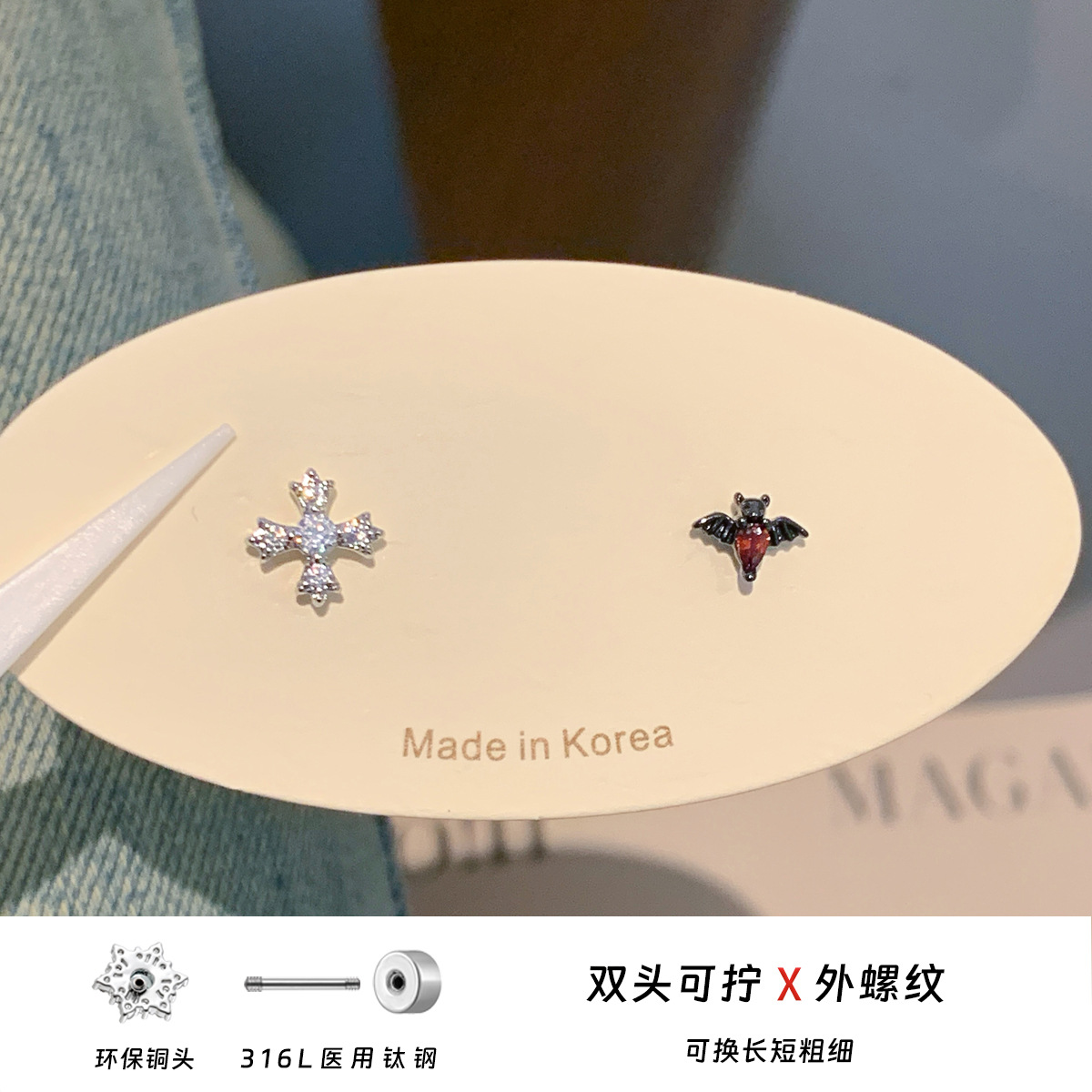 316L医用钛钢耳饰甜酷爆闪锆石十字架耳骨钉酷酷黑蝙蝠耳蜗钉耳钉
