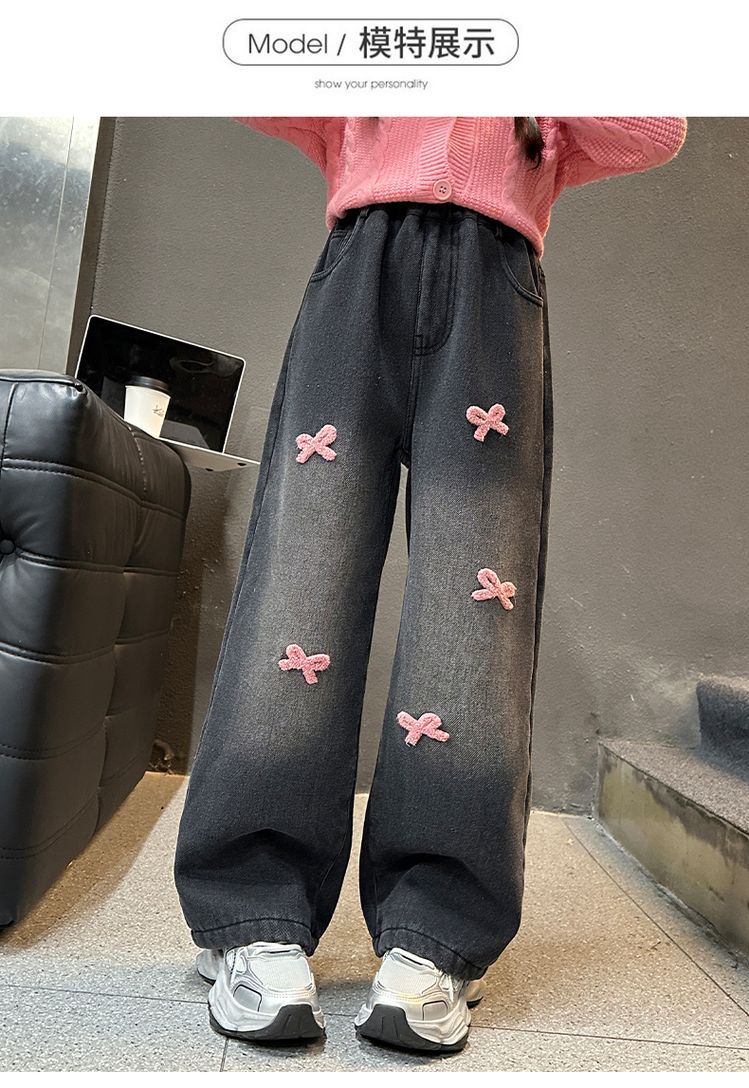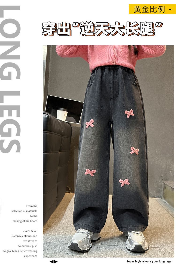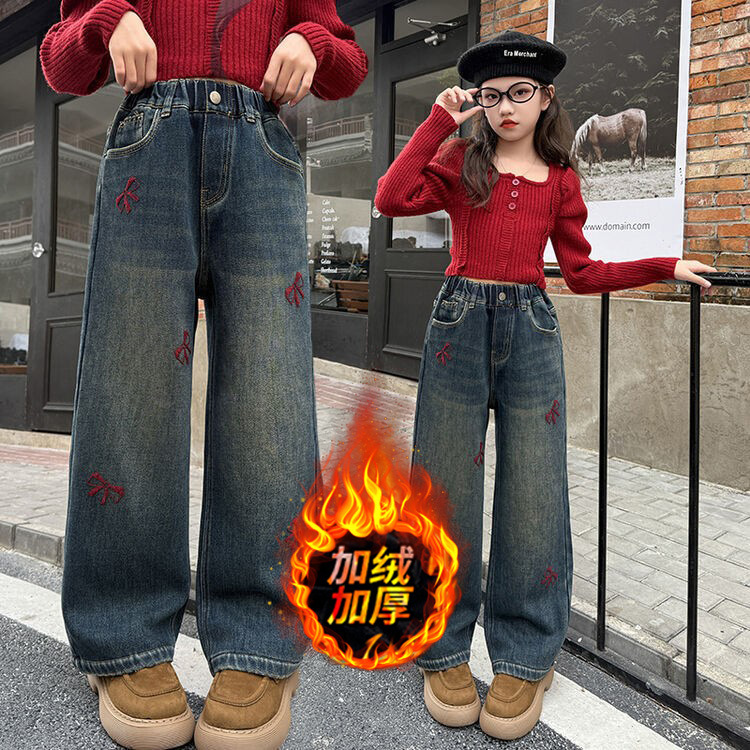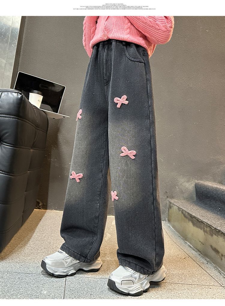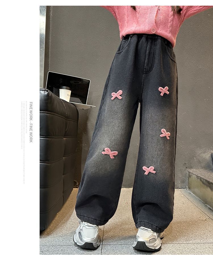 冬季新款加绒加厚女童裤子儿童洋气中大童蝴蝶结直筒牛仔裤阔腿裤