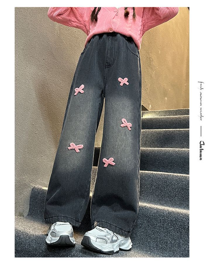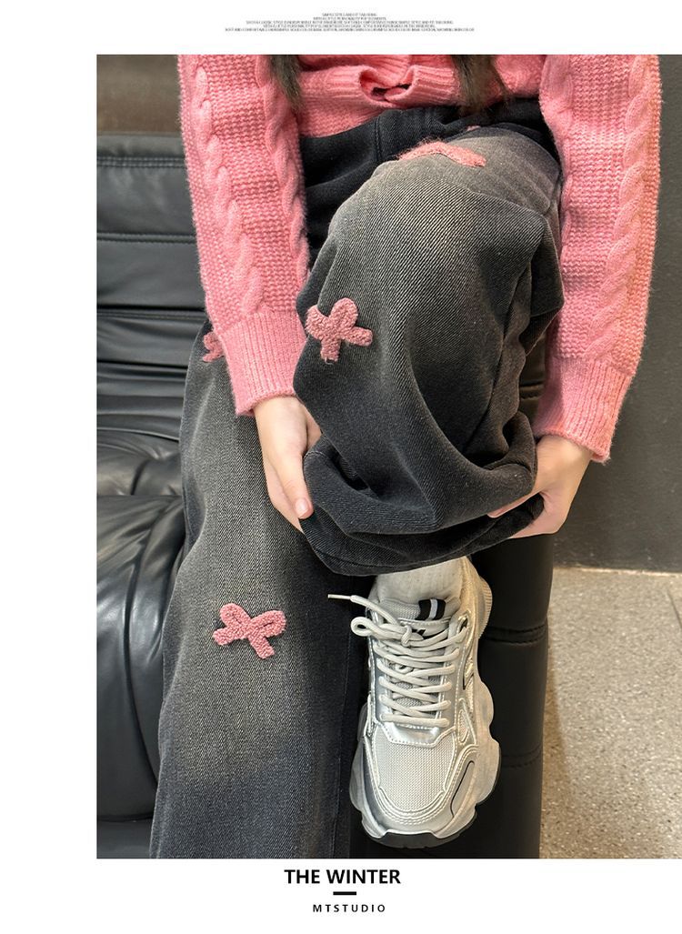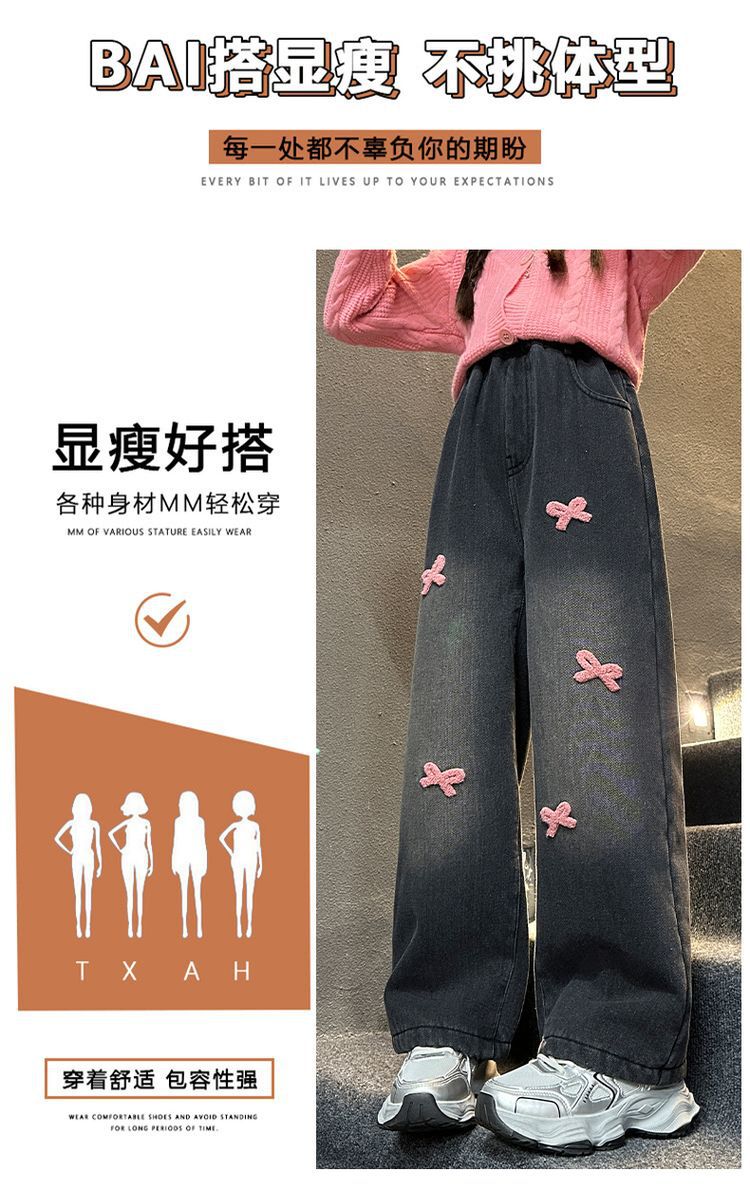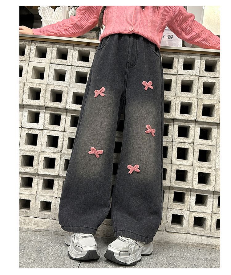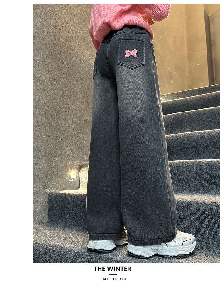 冬季新款加绒加厚女童裤子儿童洋气中大童蝴蝶结直筒牛仔裤阔腿裤
