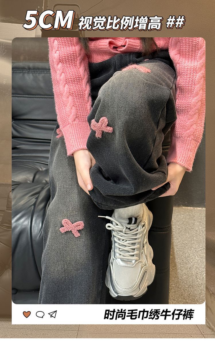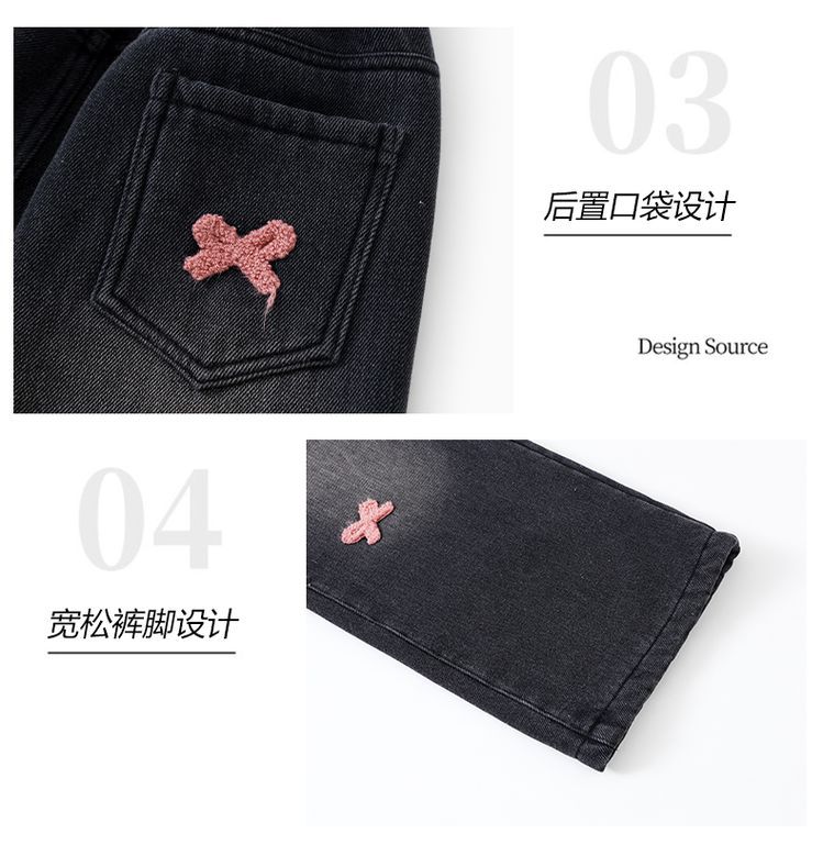 冬季新款毛巾绣女童加绒加厚直筒裤宽松阔腿裤中大童儿童牛仔长裤
