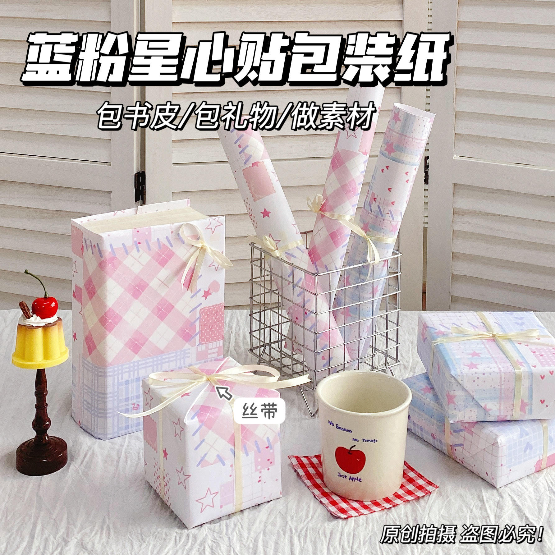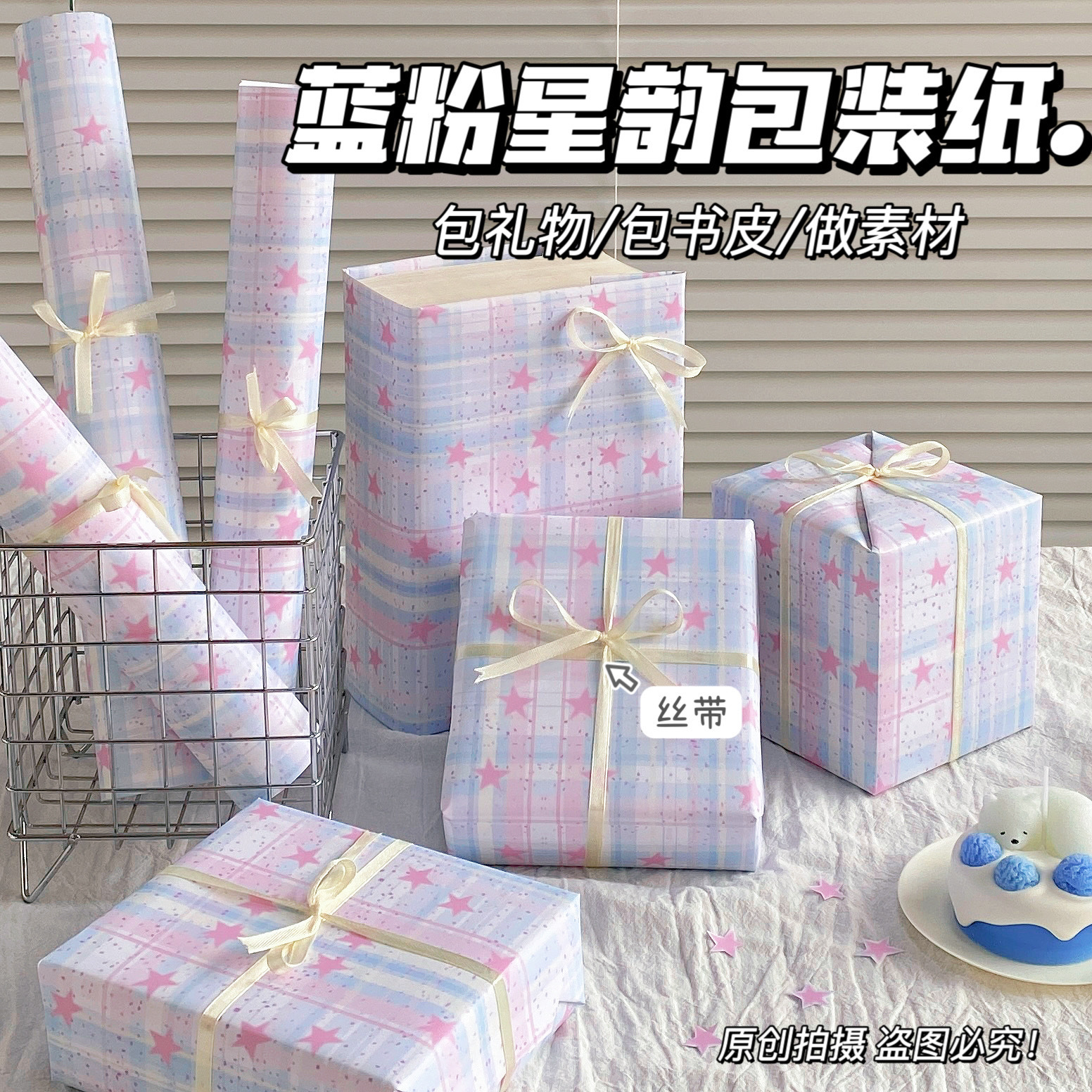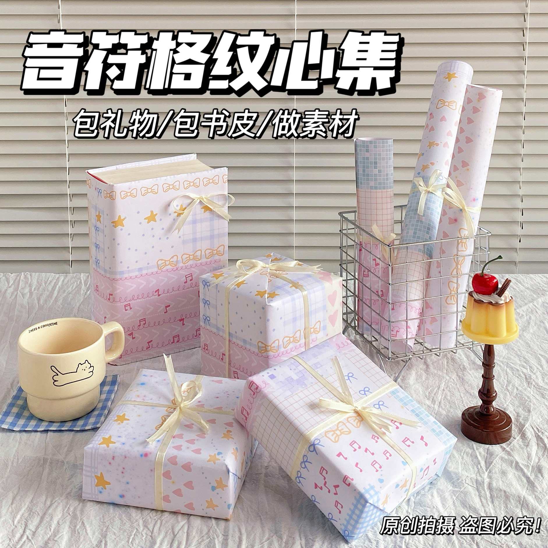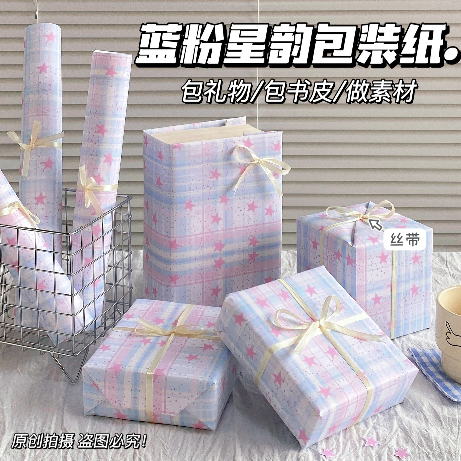 颜色 (麻绳、双面胶)各一个,郁金香小猫包装纸1包,音符格纹星心集,蓝粉星韵,蓝粉星心贴