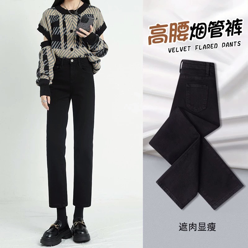 タバコのズボンの女性2025の新型の秋冬のベルベットは厚い腰の狭い版の9分の小さい背の黒色のまっすぐなジーパンをプラスします。