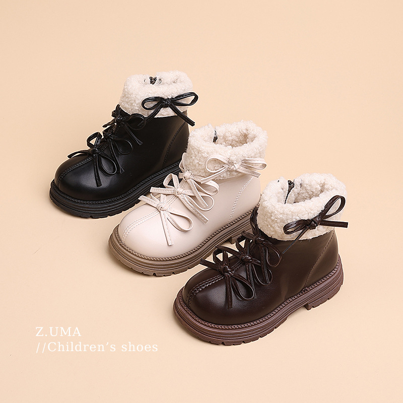 女童加绒2025马丁靴韩版蝴蝶结毛毛短靴中大童棉靴厚底公主风靴子
