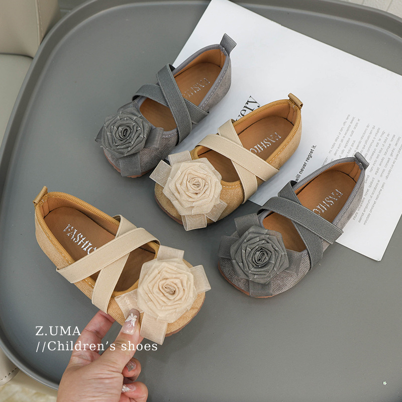 子供のレトロなフラットシューズ2024秋の浅い口の交差バンドの女の子のバレエシューズの花の中国風の靴