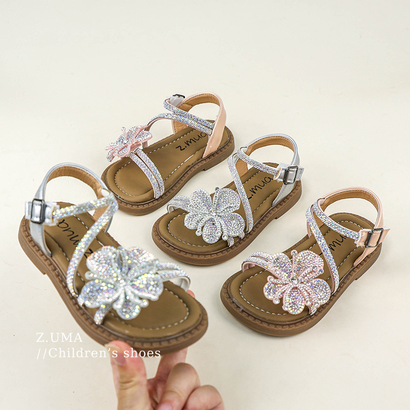 女の子の一字サンダルのお姫様靴2024年夏の新しい女の子の柔らかい底の蝶の洋気のアンドロメダのファッション靴