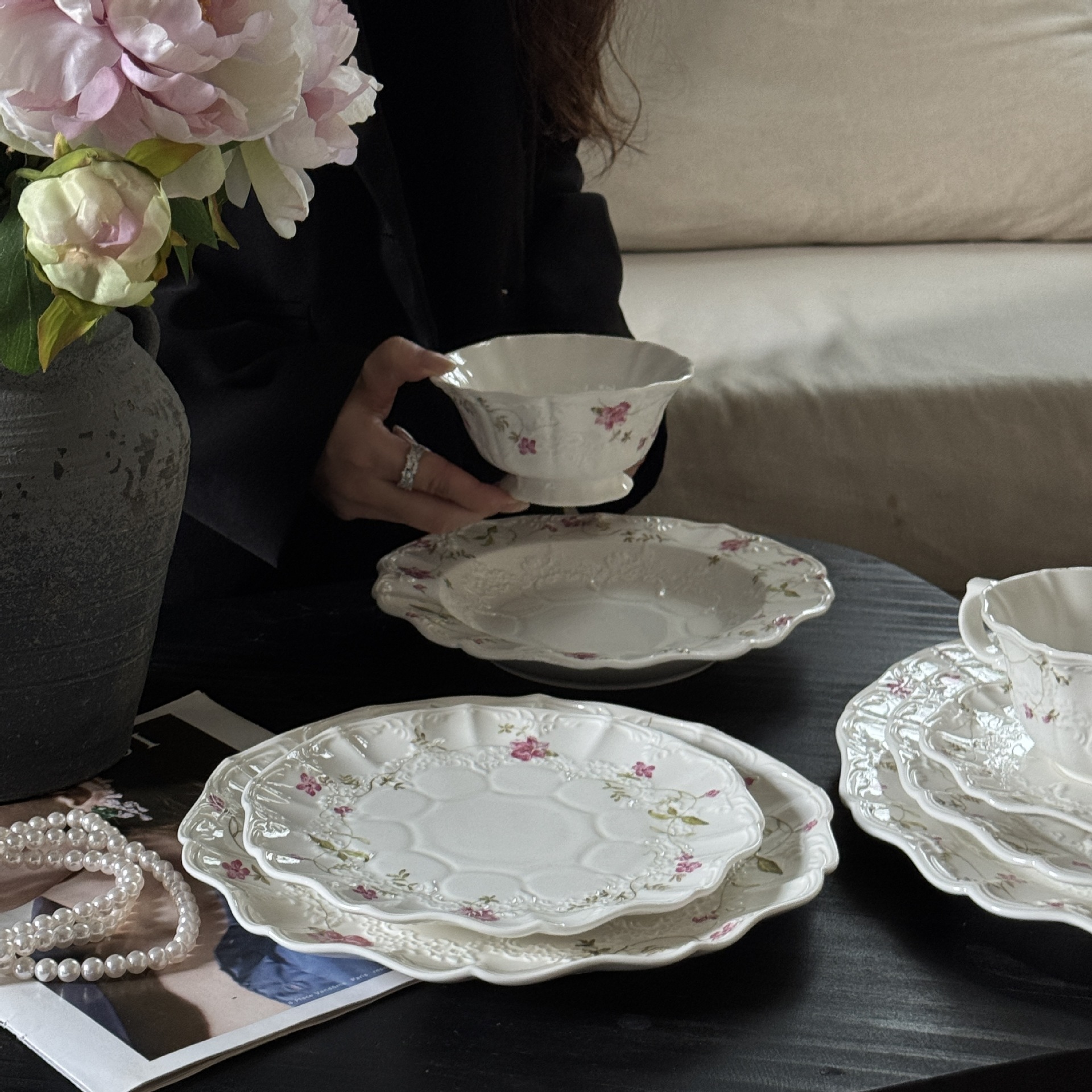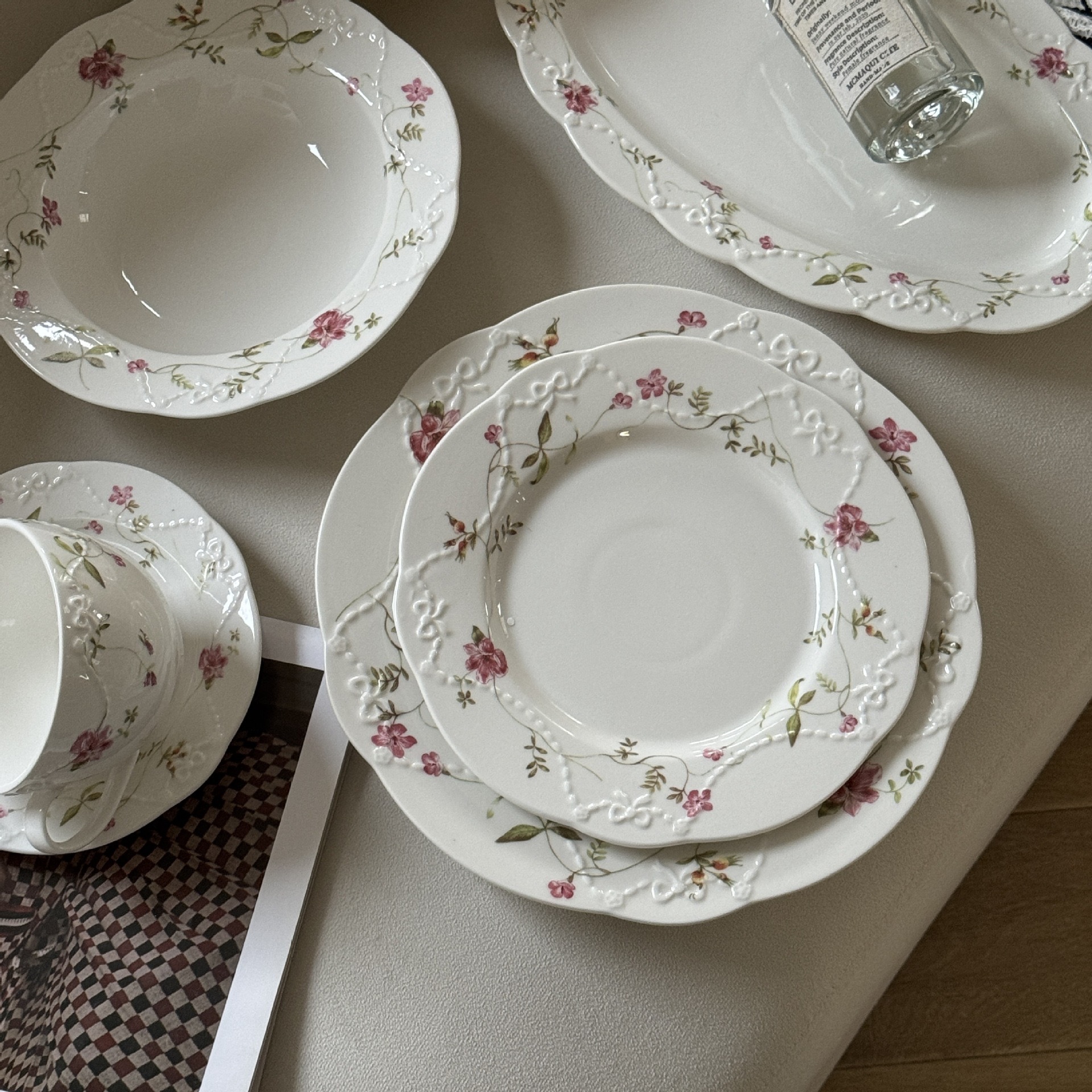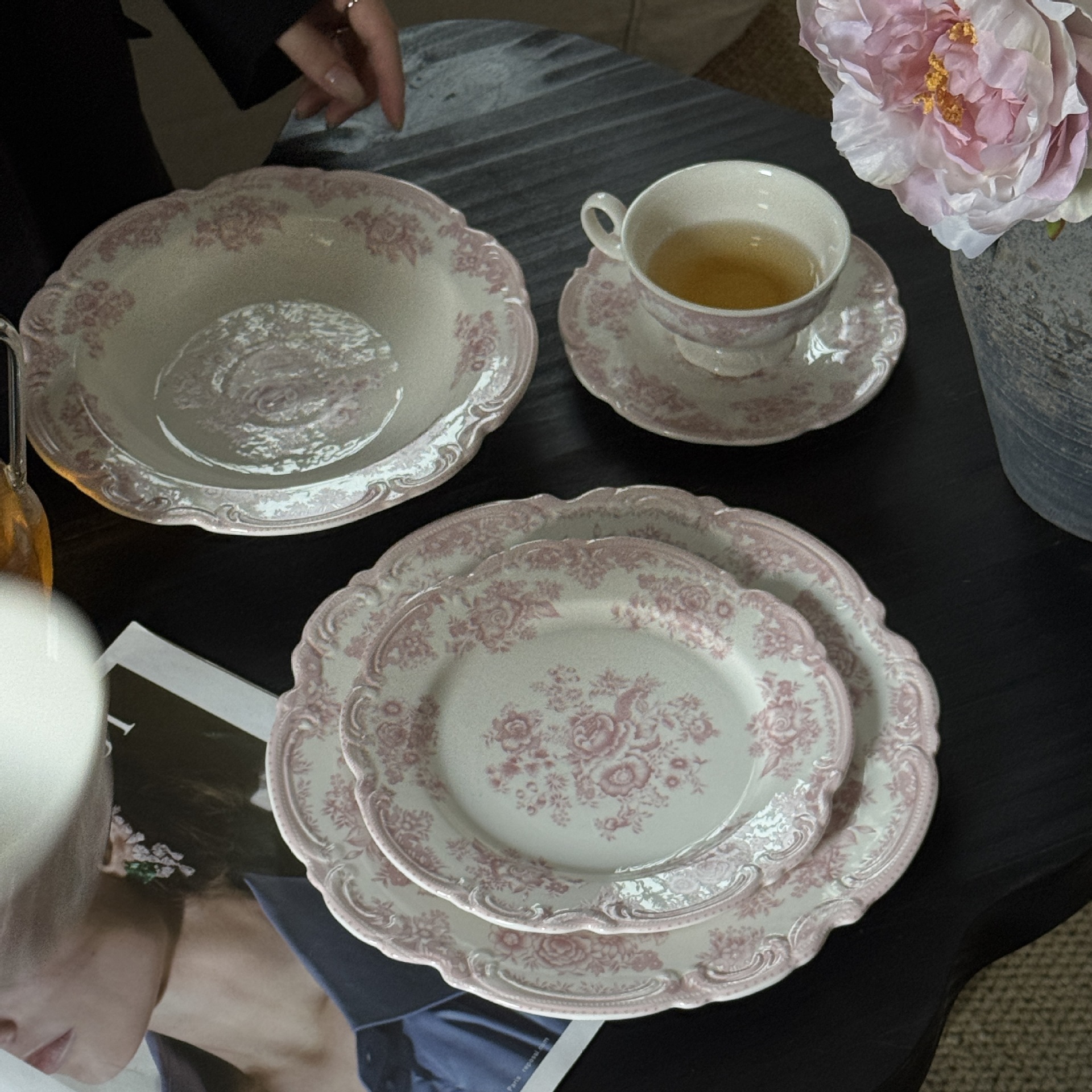 法式vintage复古粉色浮雕花卉陶瓷餐盘西餐高颜值甜品盘意面盘西