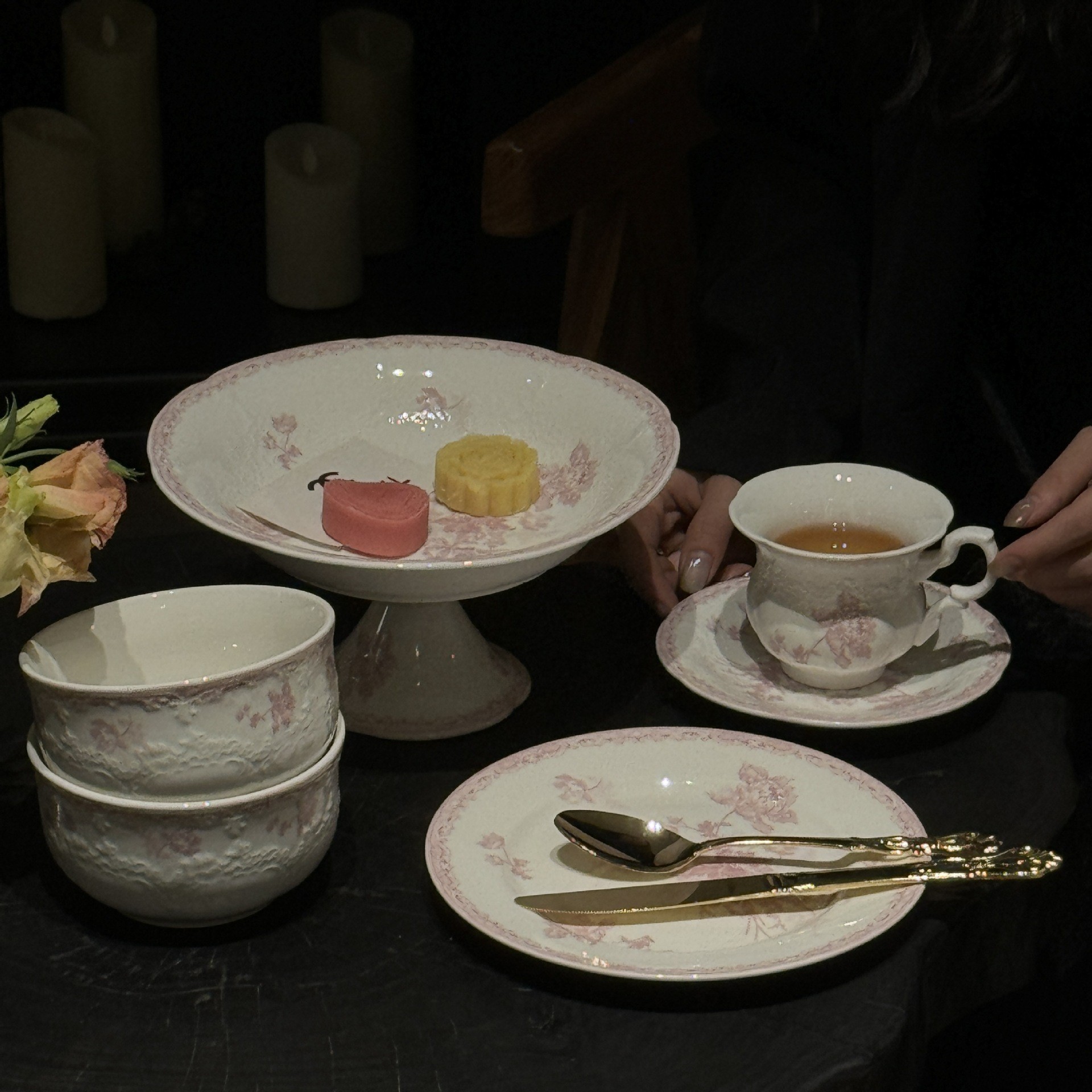 新商品超美女心ピンク花卉レリーフ陶磁器シリーズランチカップ皿ケーキ高足皿