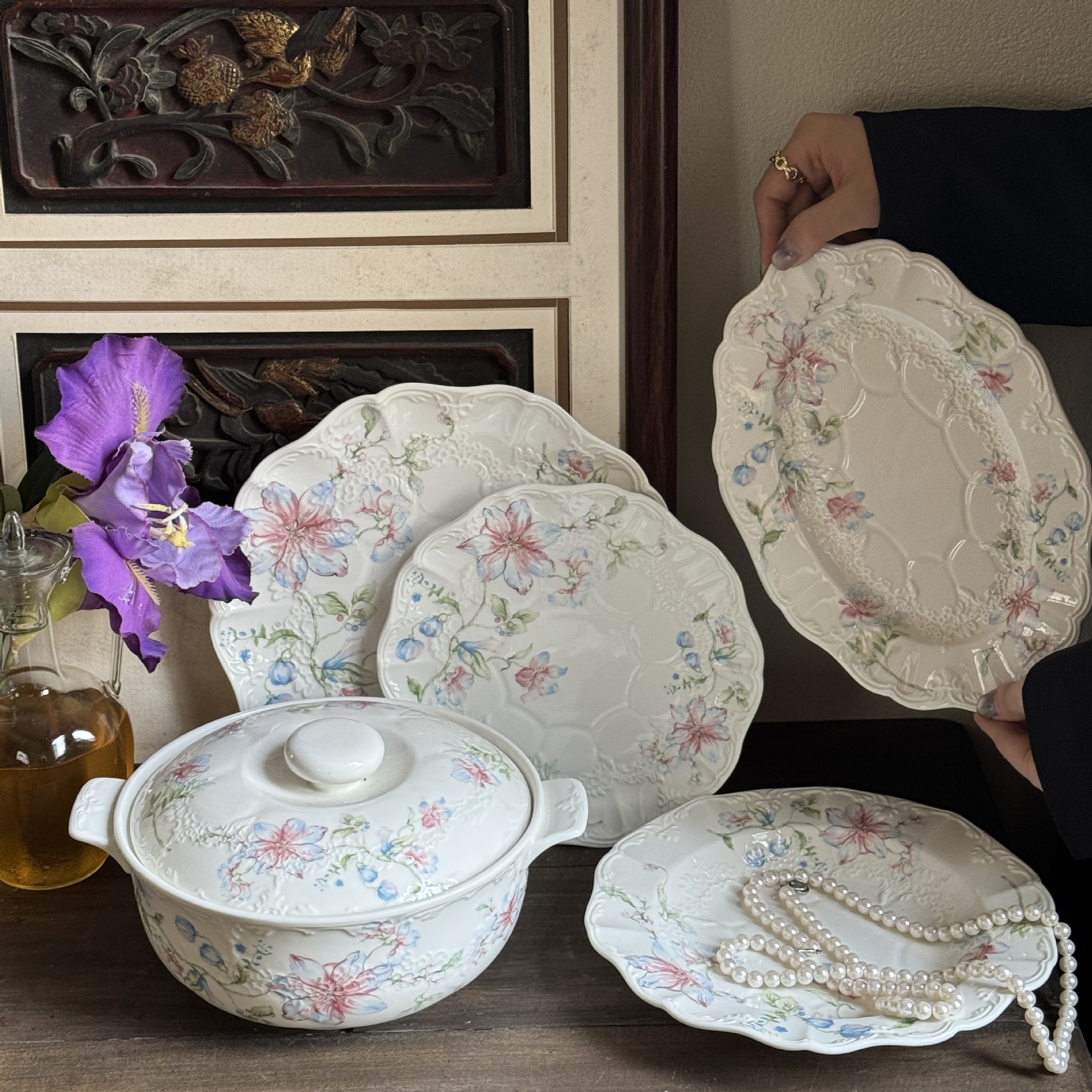 フランスの逃亡王女美しいレリーフ花柄セラミックプレートボウルデザートプレートスーププレート食器セット卸売在庫あり