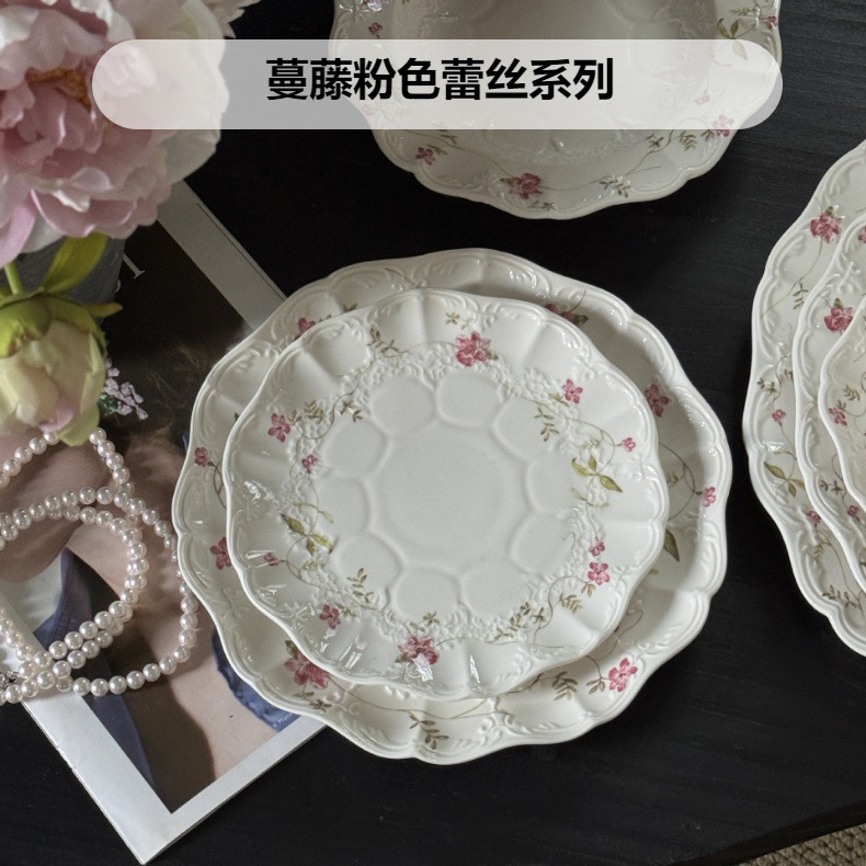 新しいフレンチレトロレースピンクローズレリーフセラミックプレートアフタヌーンティーデザートプレート洋食ホームプレート