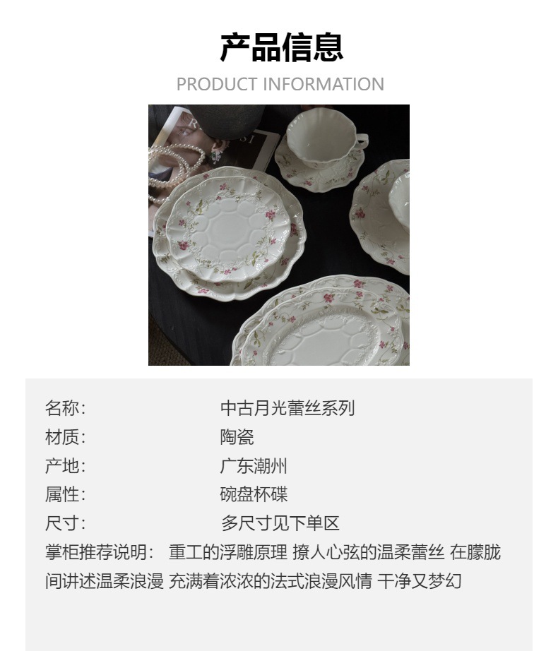 颜色 月光蕾丝碗12.5*6CM,月光蕾丝杯碟250ML,月光蕾丝8寸盘20*2CM,月光蕾丝10寸盘25*2CM,月光蕾丝汤盘22.5*3.5CM,10寸椭圆盘25*17*2,12寸椭圆盘30*20*2