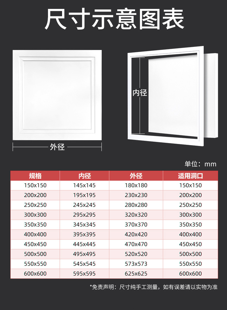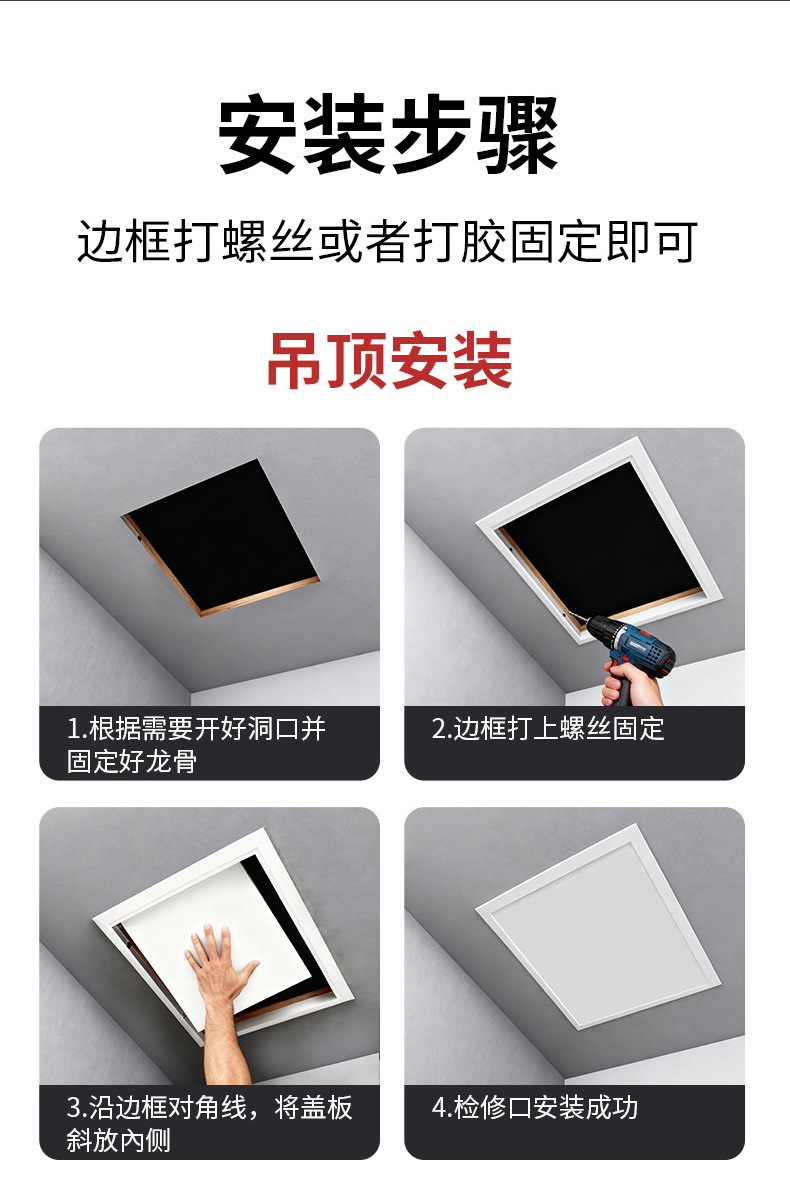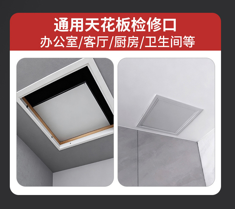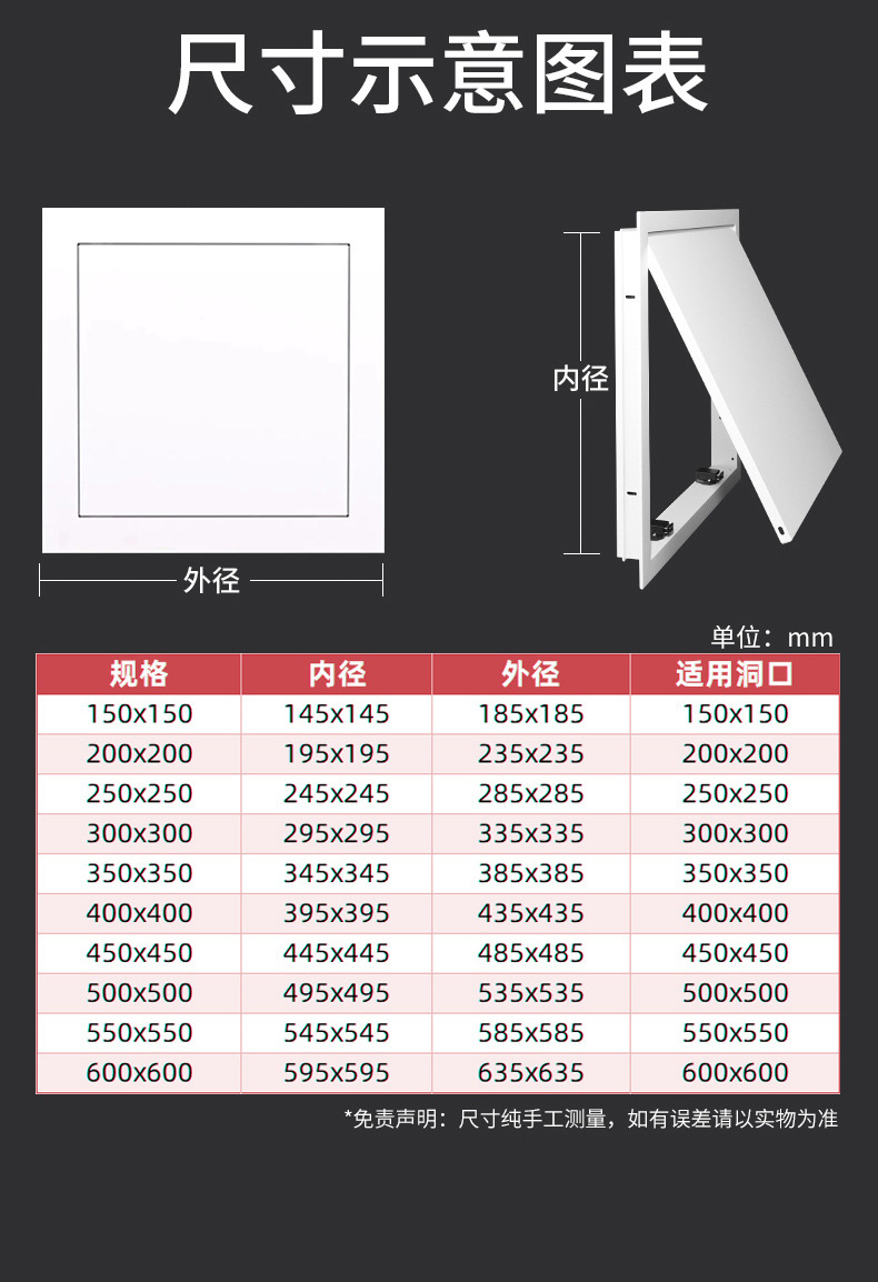 规格 吊顶托板式 开孔66*66,吊顶托板式 开孔150*150,吊顶托板式 开孔200*200,吊顶托板式 开孔250*250,吊顶托板式 开孔300*300,吊顶托板式 开孔350*350,吊顶托板式 开孔400*400,吊顶托板式 开孔450*450,吊顶托板式 开孔500*500,吊顶托板式 开孔550*550,吊顶托板式 开孔600*600,磁吸按压式 开孔150*150,磁吸按压式 开孔200*200,磁吸按压式 开孔250*250,磁吸按压式 开孔300*300,磁吸按压式 开孔350*350,磁吸按压式 开孔400*400,磁吸按压式 开孔450*450,磁吸按压式 开孔500*500,磁吸按压式 开孔550*550,磁吸按压式 开孔600*600,锁式(无钥匙)检修口 开孔150*150,锁式(无钥匙)检修口 开孔200*200,锁式(无钥匙)检修口 开孔250*250,锁式(无钥匙)检修口 开孔300*300,锁式(无钥匙)检修口 开孔350*350,锁式(无钥匙)检修口 开孔400*400,锁式(无钥匙)检修口 开孔450*450,锁式(无钥匙)检修口 开孔500*500