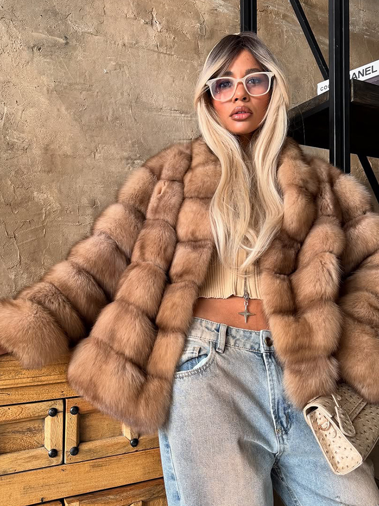 跨境欧美女装2025冬季新款环保皮草外套女宽松仿狐狸毛毛连帽上衣
