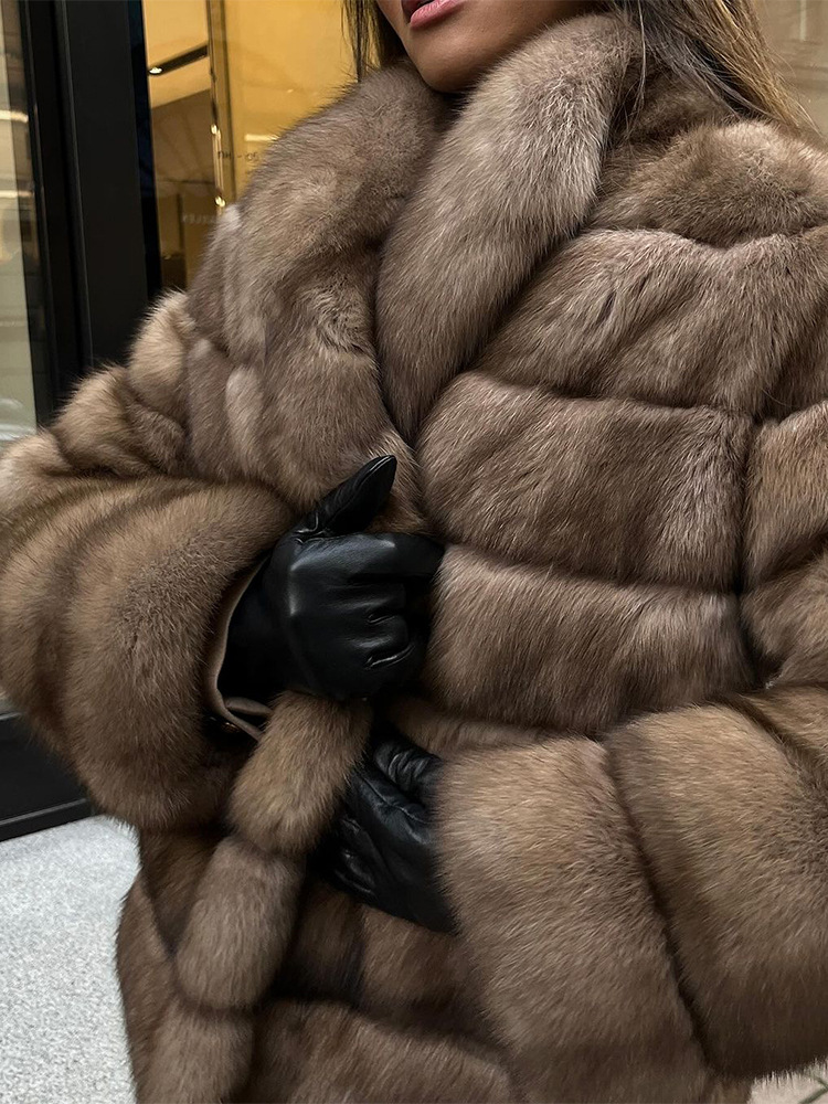 实拍-气质高级感拼接翻领长绒皮草外套2025跨境欧美风秋冬新款